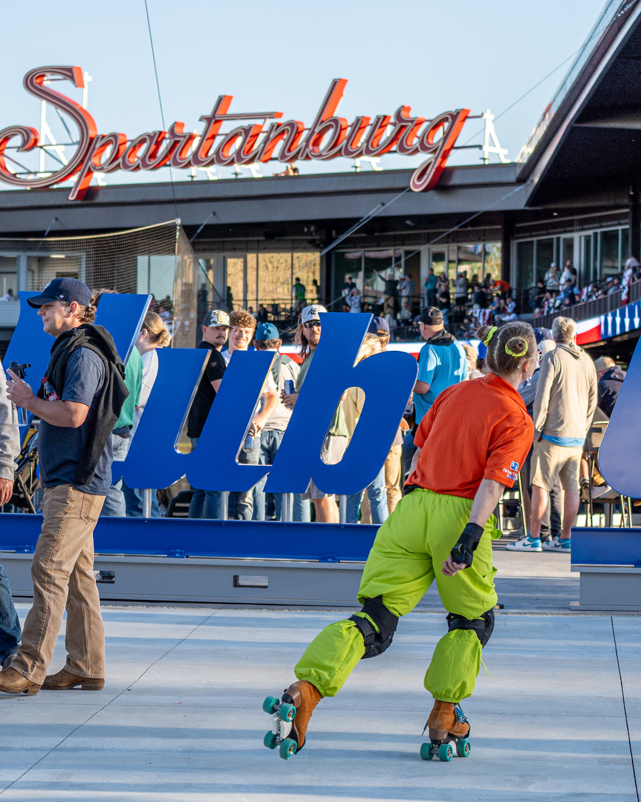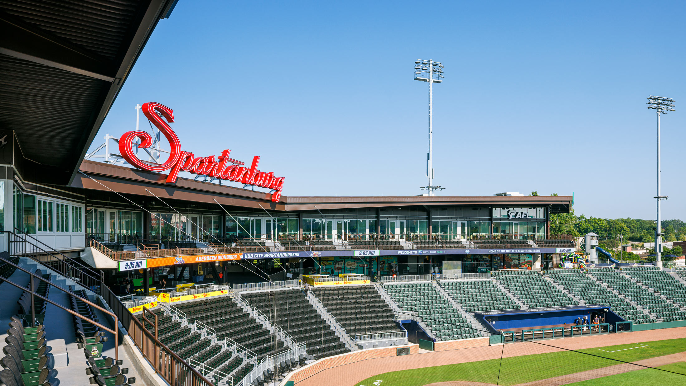 Signage of the custom “Spartanburg” script mark features dimensional letters with exposed LED lighting for maximum impact both day and night, and is mounted above home plate, creating an iconic landmark for the surrounding neighborhood.