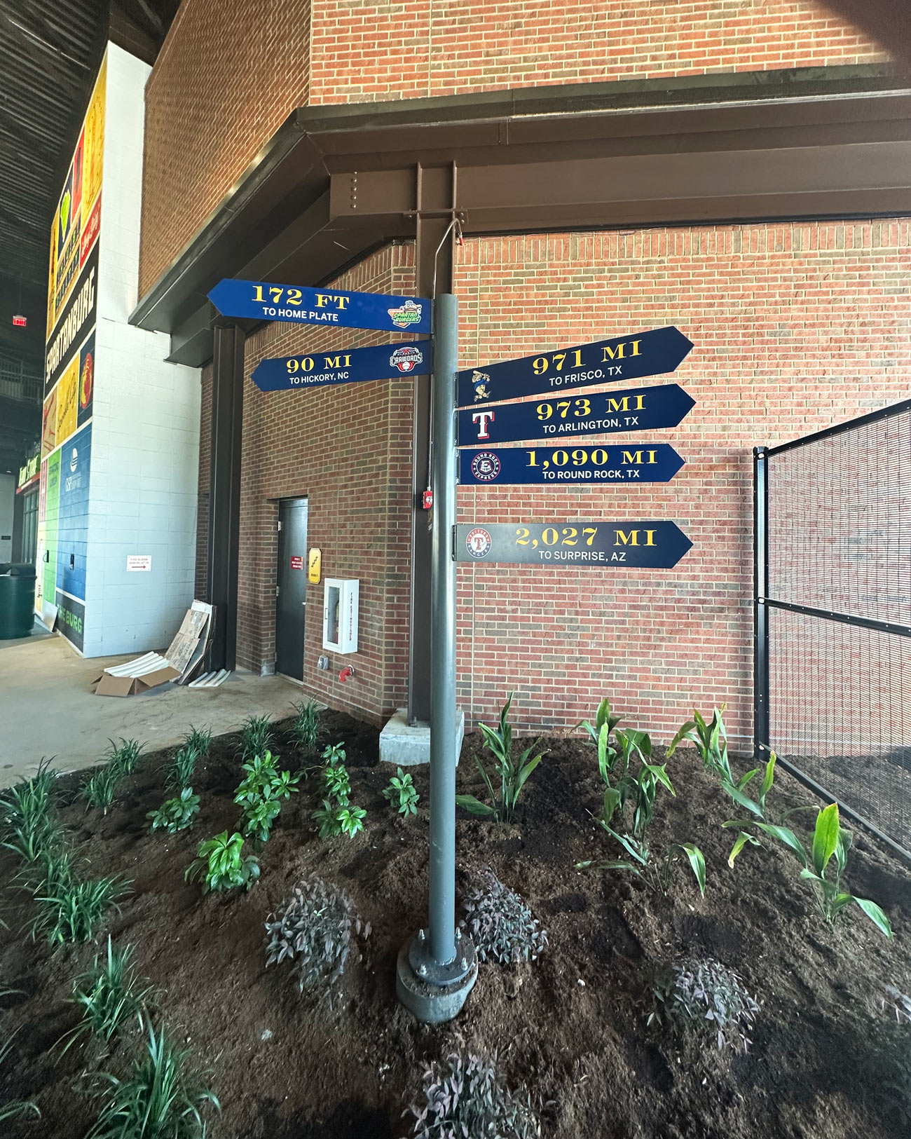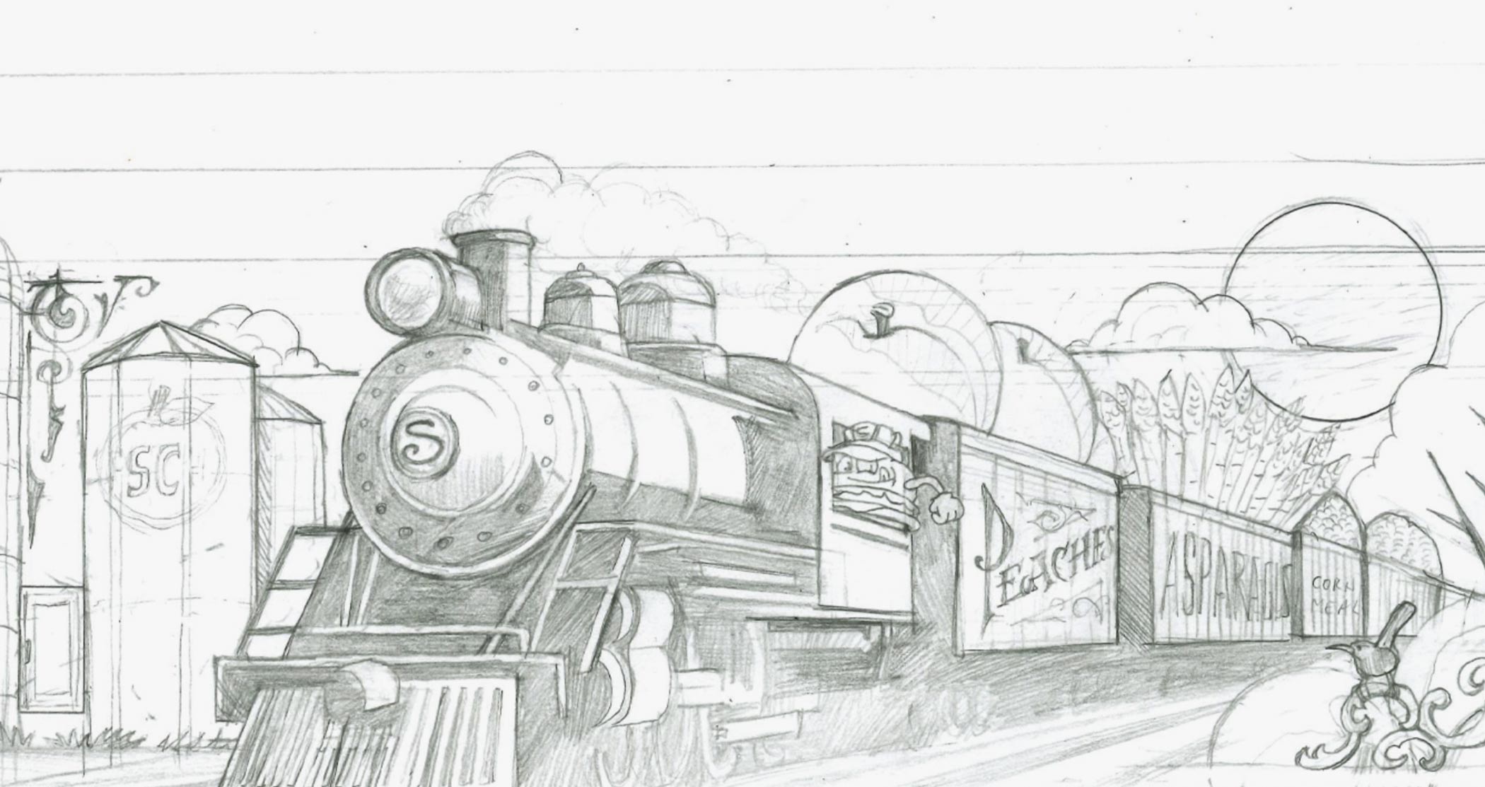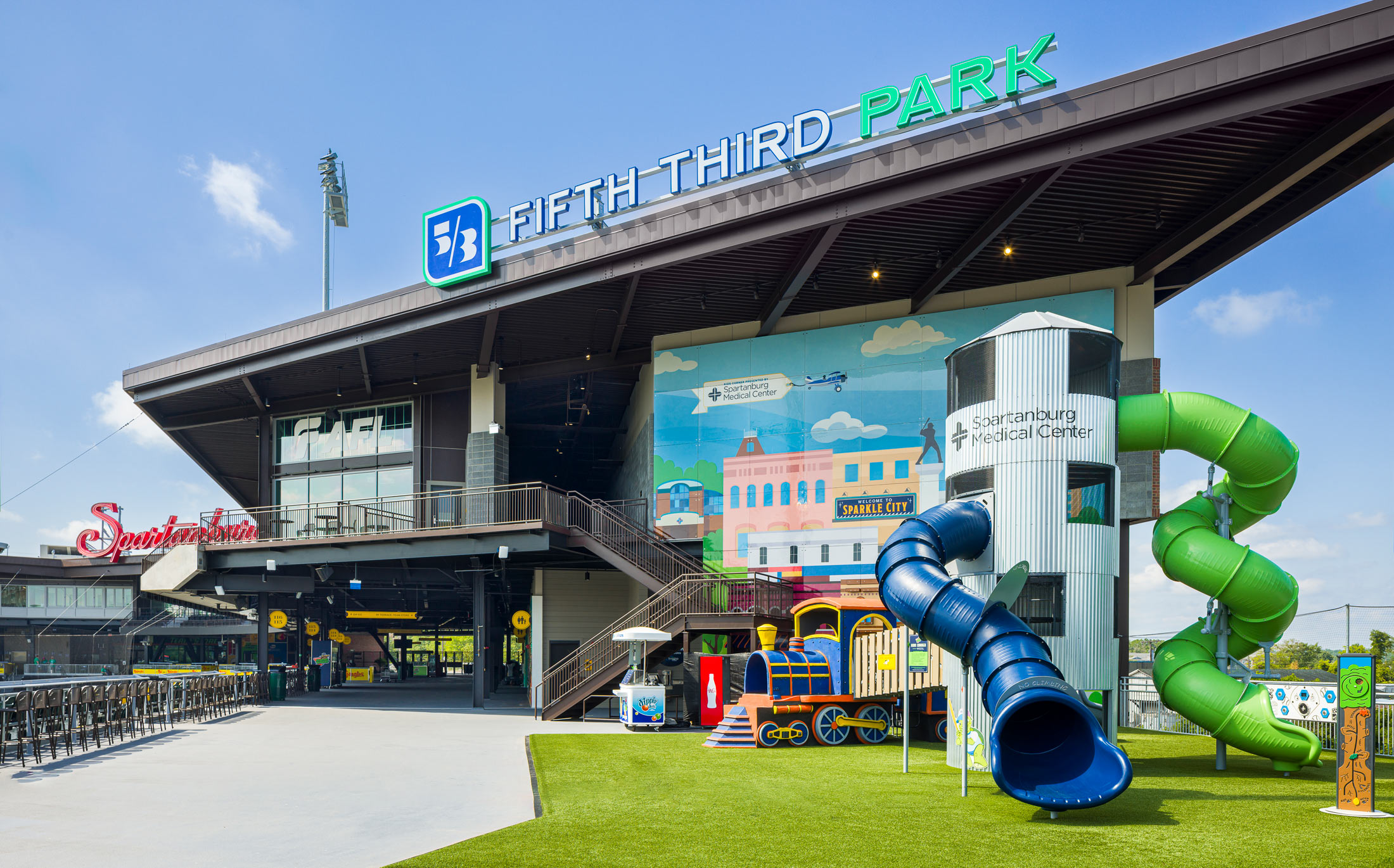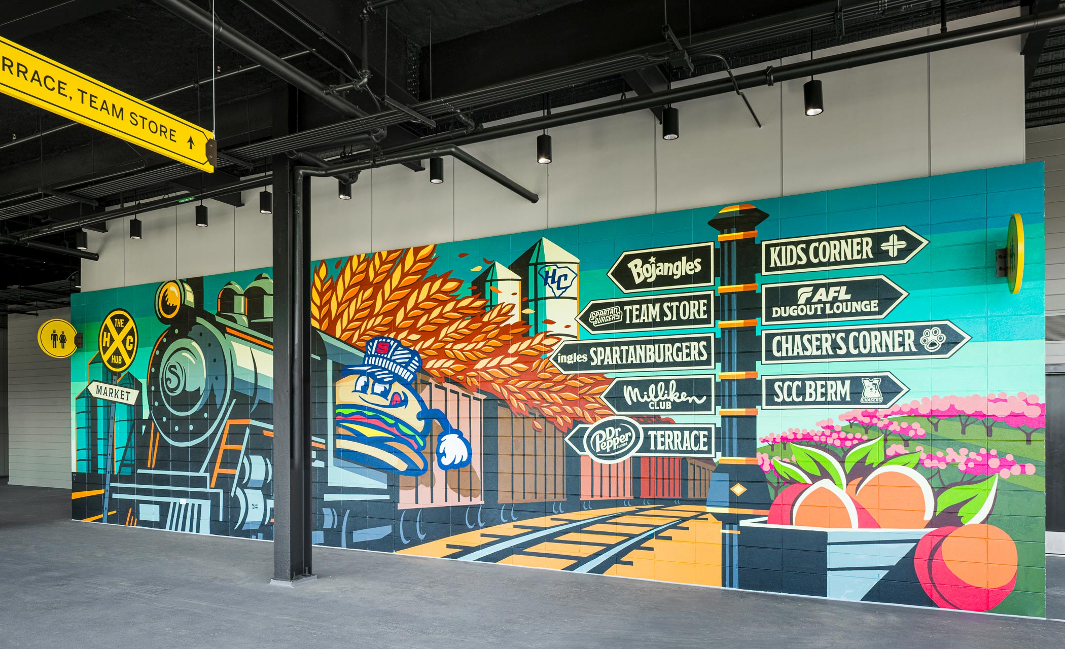 Large-scale murals at the park pay homage to the city of Spartanburg. A directional mural includes the team’s mascot “Chuck,” complete with conductor hat, in a train-themed panorama. YDI developed this mural through a series of thorough sketches, taking care to incorporate various elements of Spartanburg history.