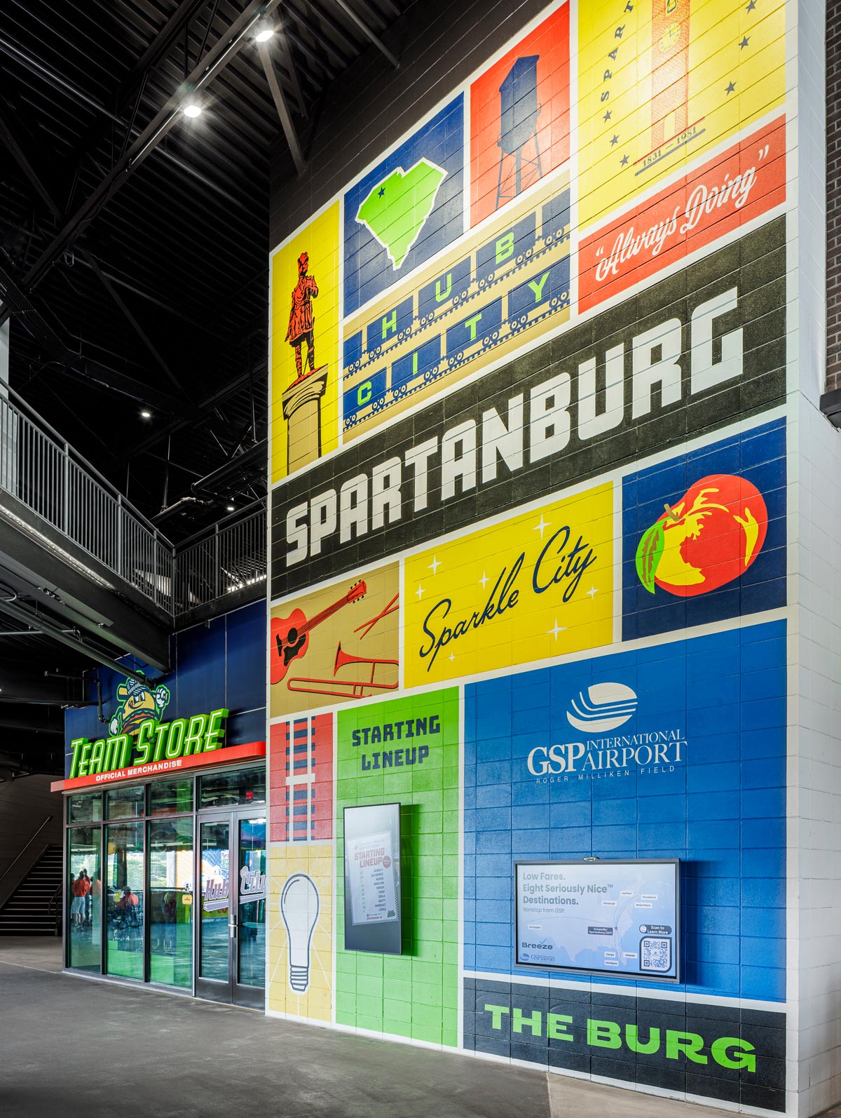 Nearby in the Atrium, another large-scale mural with a gridded design includes some of the city’s claims to fame, from peaches and Spartanburg’s “Sparkle City” moniker to silos representing the grain industry. Its bright colors and bold lettering provide another iconic backdrop in the concourse.