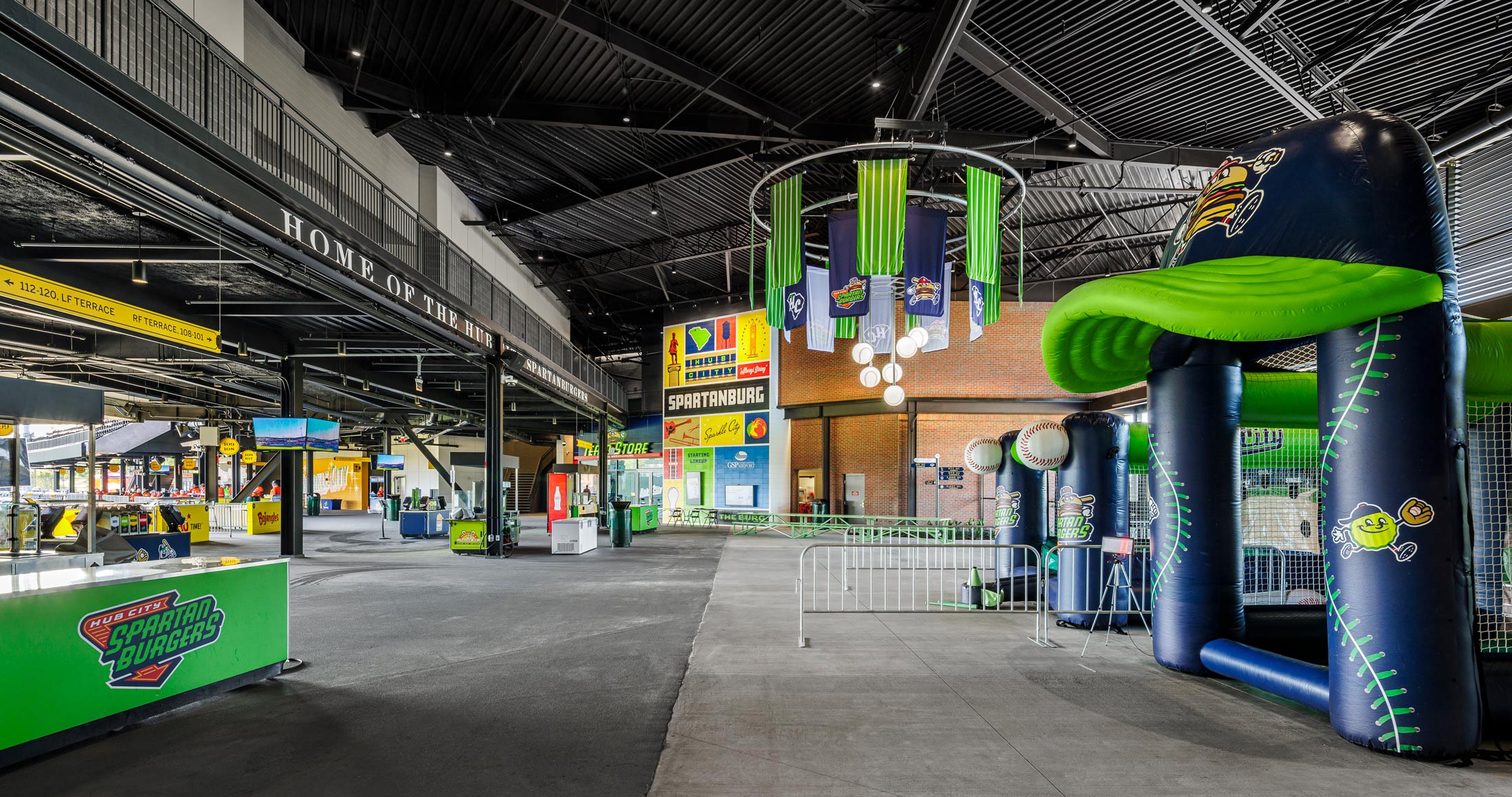 Directional signage throughout the park takes its inspiration from railroad iconography, using classic numerals and familiar inset shapes to aid in wayfinding. The bright, eye-catching palette works in tandem with the Spartanburgers’ brand color scheme and its highlight green.