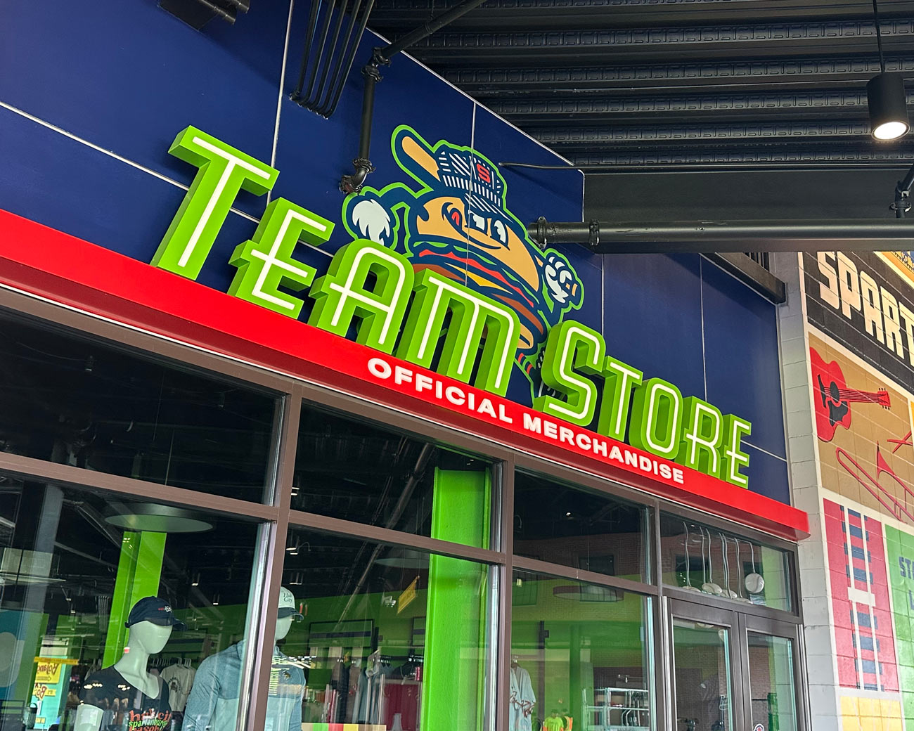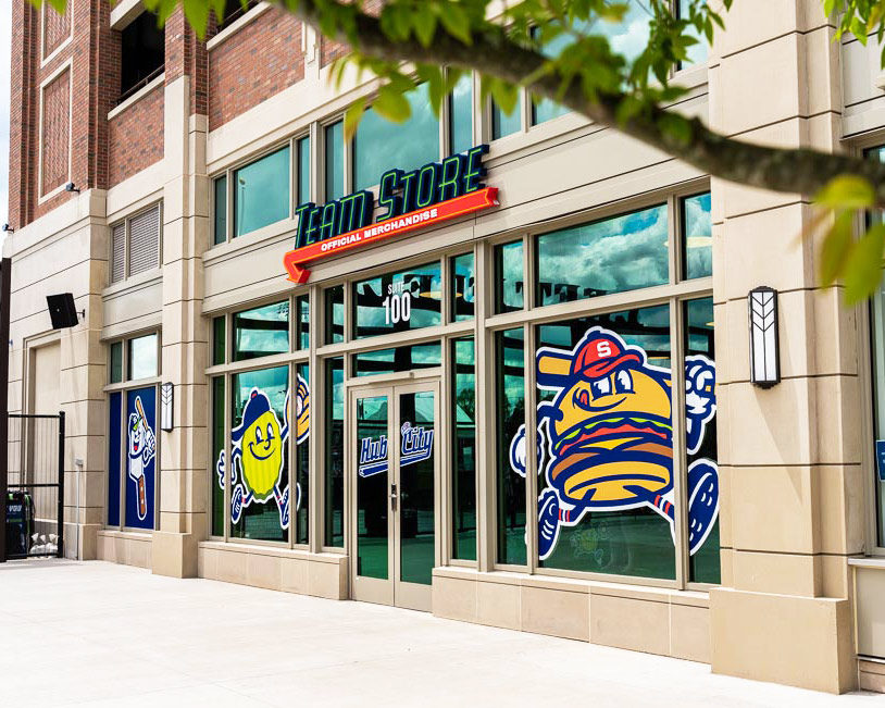 YDI designed signage for both Team Stores at Fifth Third Park, one exterior facing and one within the concourse. Storefronts feature large-scale window graphics of the team’s food-themed mascots. Internally illuminated letters provide softer lighting, and a bright red underline ties into the surrounding architecture.