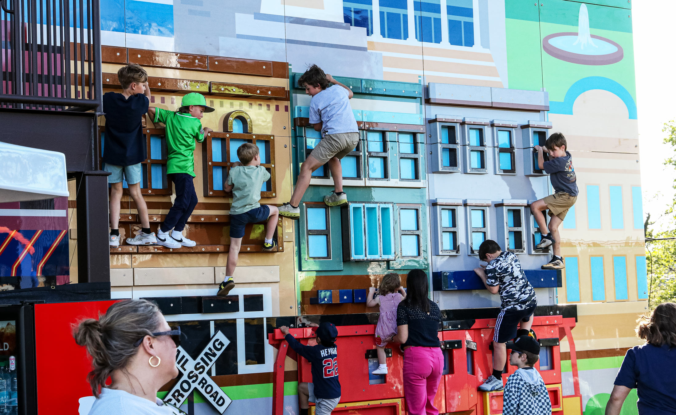The Kids Corner, presented by Spartanburg Medical Center, features a mural wall with climbable replicas of some of downtown Spartanburg’s buildings designed by YDI, as well as a train-themed play area. Elsewhere, a pair of slides wrap around a miniature silo.