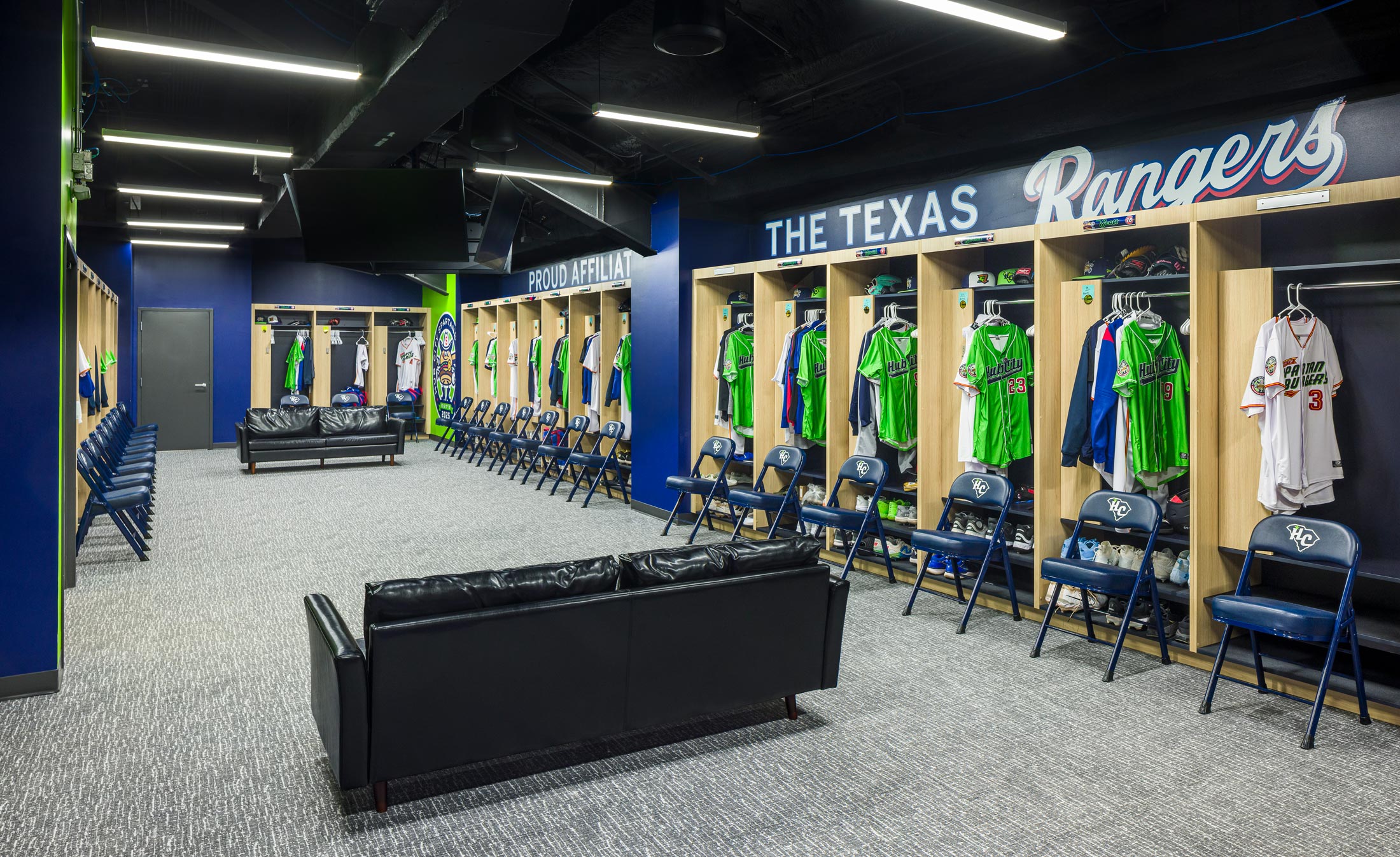 The Spartanburgers’ clubhouse pays homage to the team’s affiliate: the Texas Rangers, and features wallcoverings made from archival photographs, large team logo graphics, retired number displays for the Rangers, and an iconic “Hub City” graphic that incorporates an old map of the area.