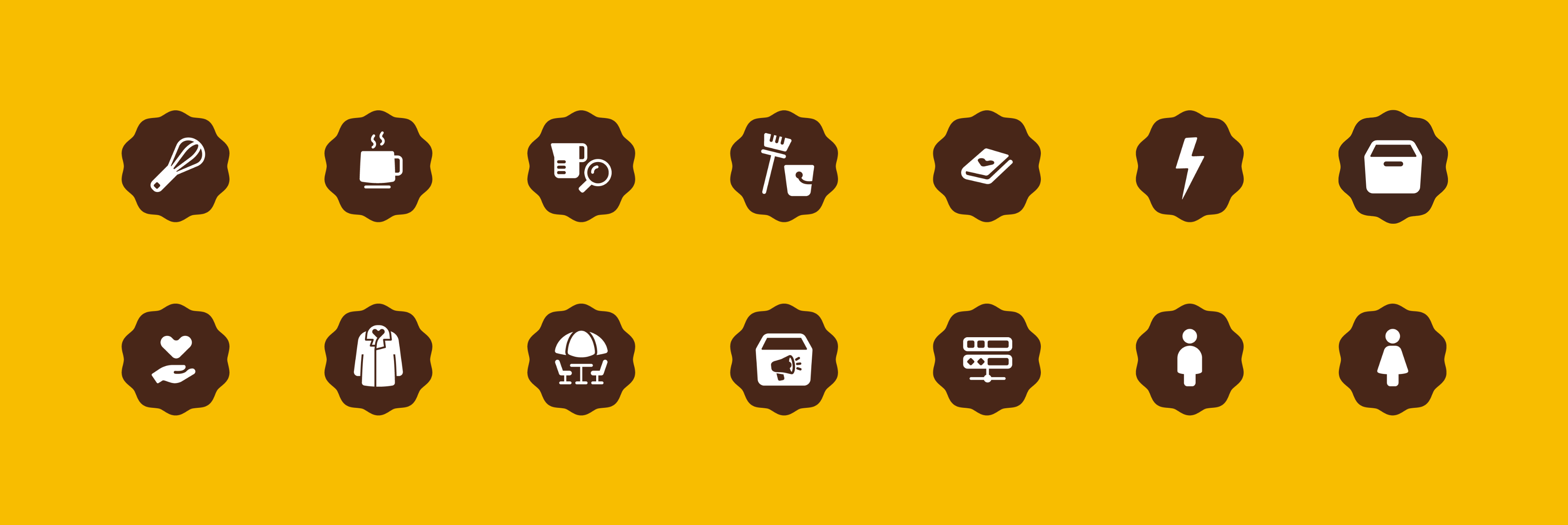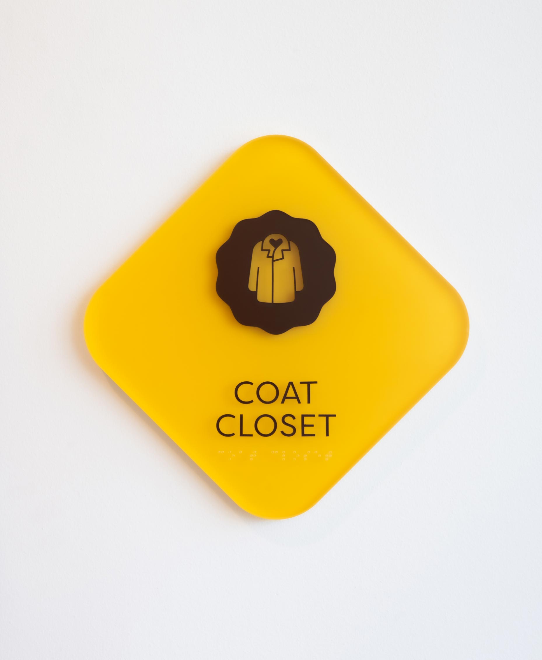 Each pictogram in the signage family appears in an abstracted waffle shape, emphasizing the fun-loving and light-hearted nature of the project. The icons show a strong visual tie to the brand through their softened corners and subtle brand references. Elsewhere, consistent sign panel shapes and colors lend a cohesive visual language to office rooms and cubicle spaces.