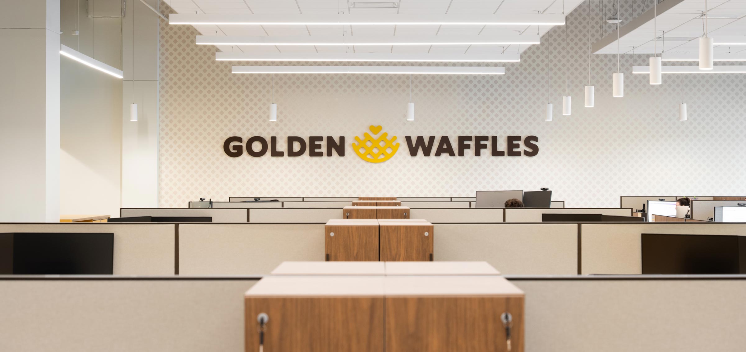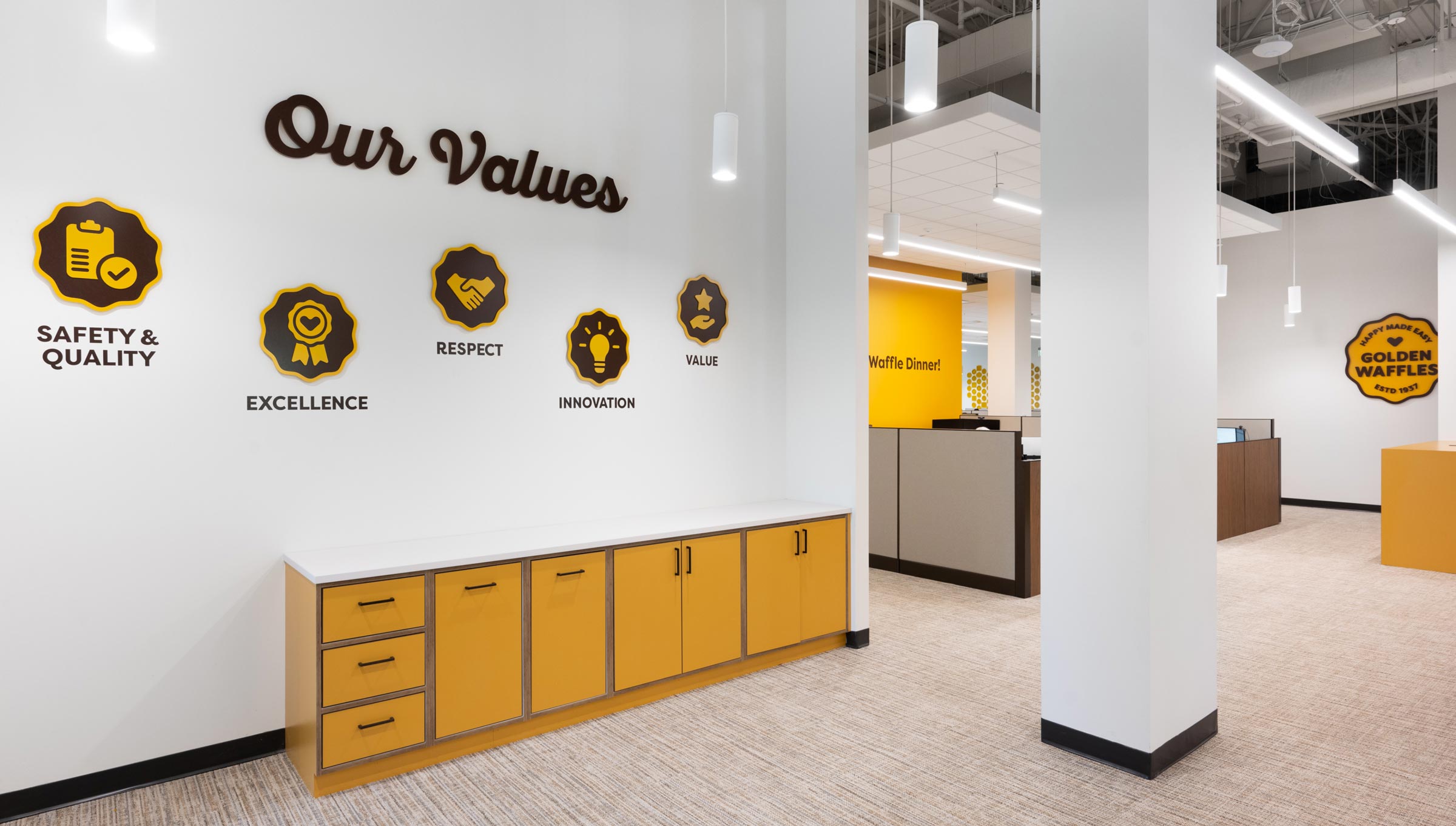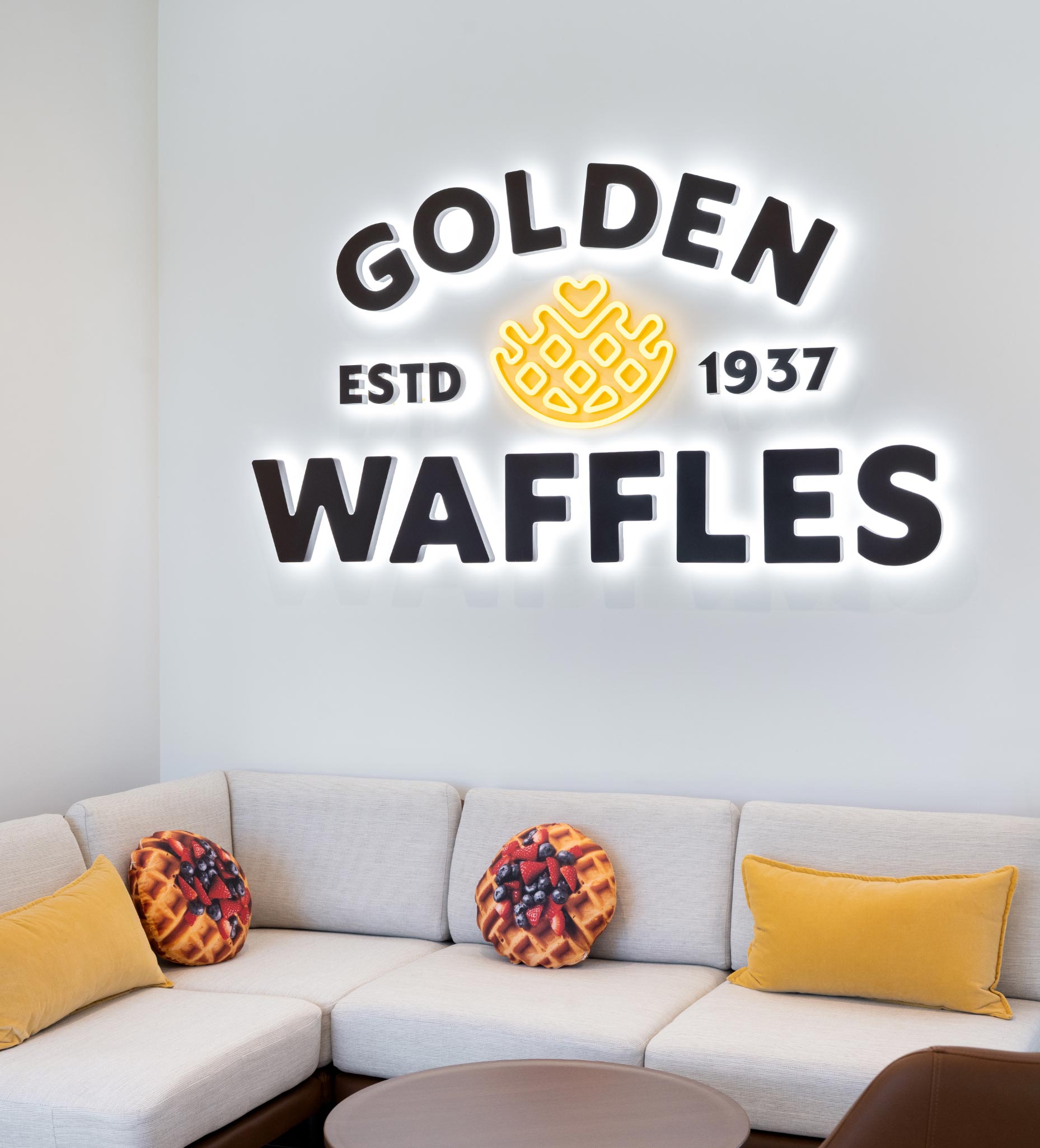 This project gave YDI several fun opportunities to enliven Golden Waffles’ headquarters with bright graphics and signage that reinforce their brand and celebrate their history. From illuminated identity signage to walls depicting company history and values, to ADA signage, YDI infused the Golden Waffles brand into every corner of the space.