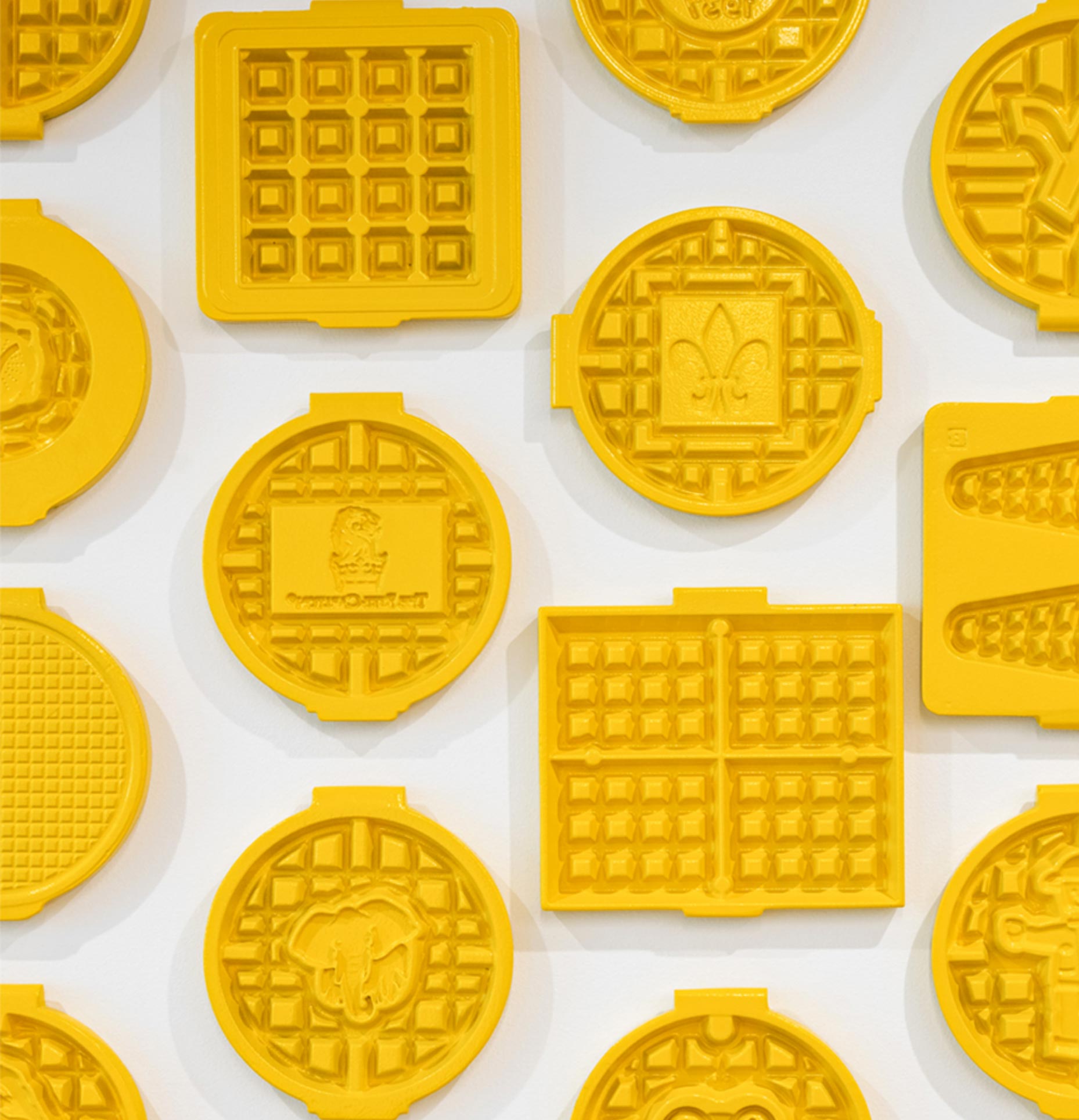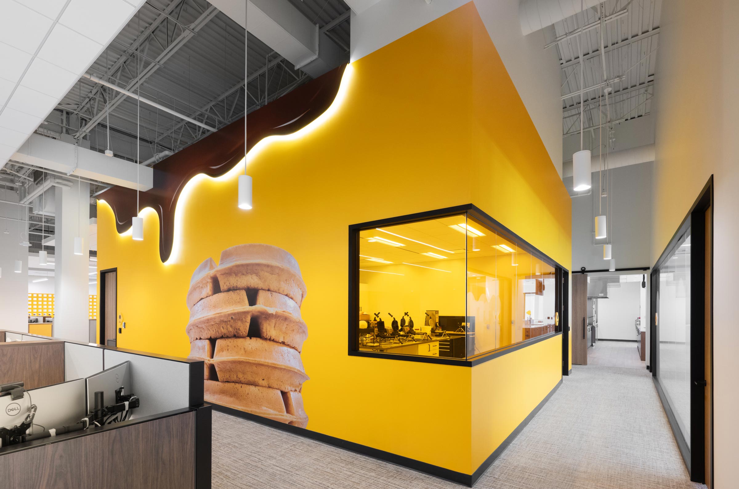 YDI used the interior space as a canvas, designing exciting and innovative ways to display the client’s company culture. The upbeat and lively tone of the project allowed for graphics that fill the space with bright and bold moments: a heart shaped display of various custom waffle irons that recalls the heart in Golden Waffles’ logo, and a large-scale wall graphic of a waffle beneath a halo-lit syrup drip.