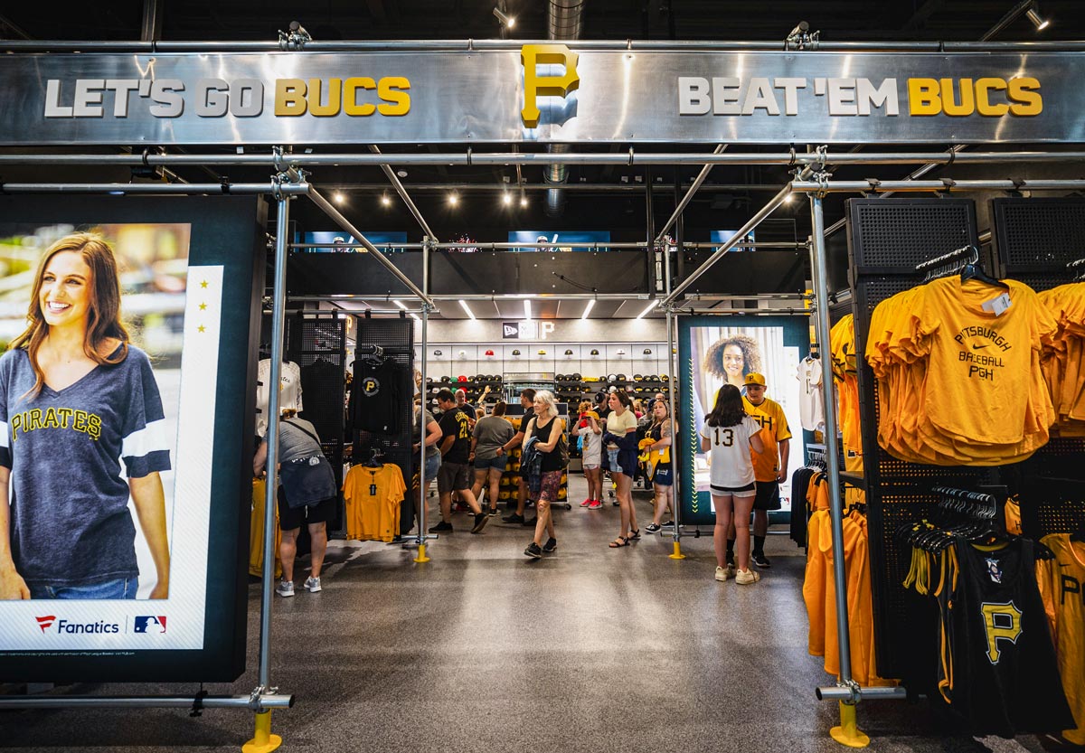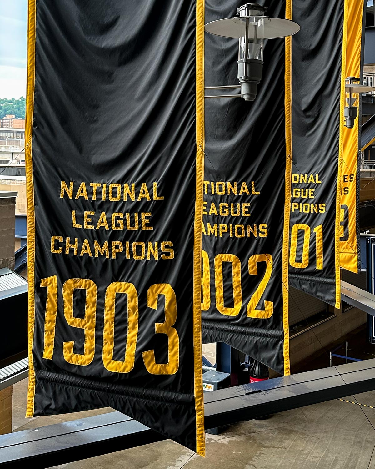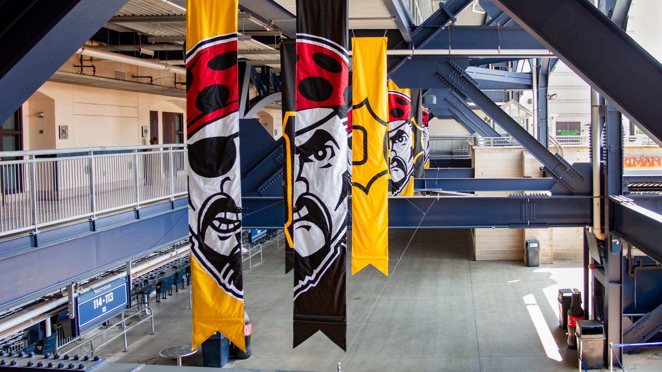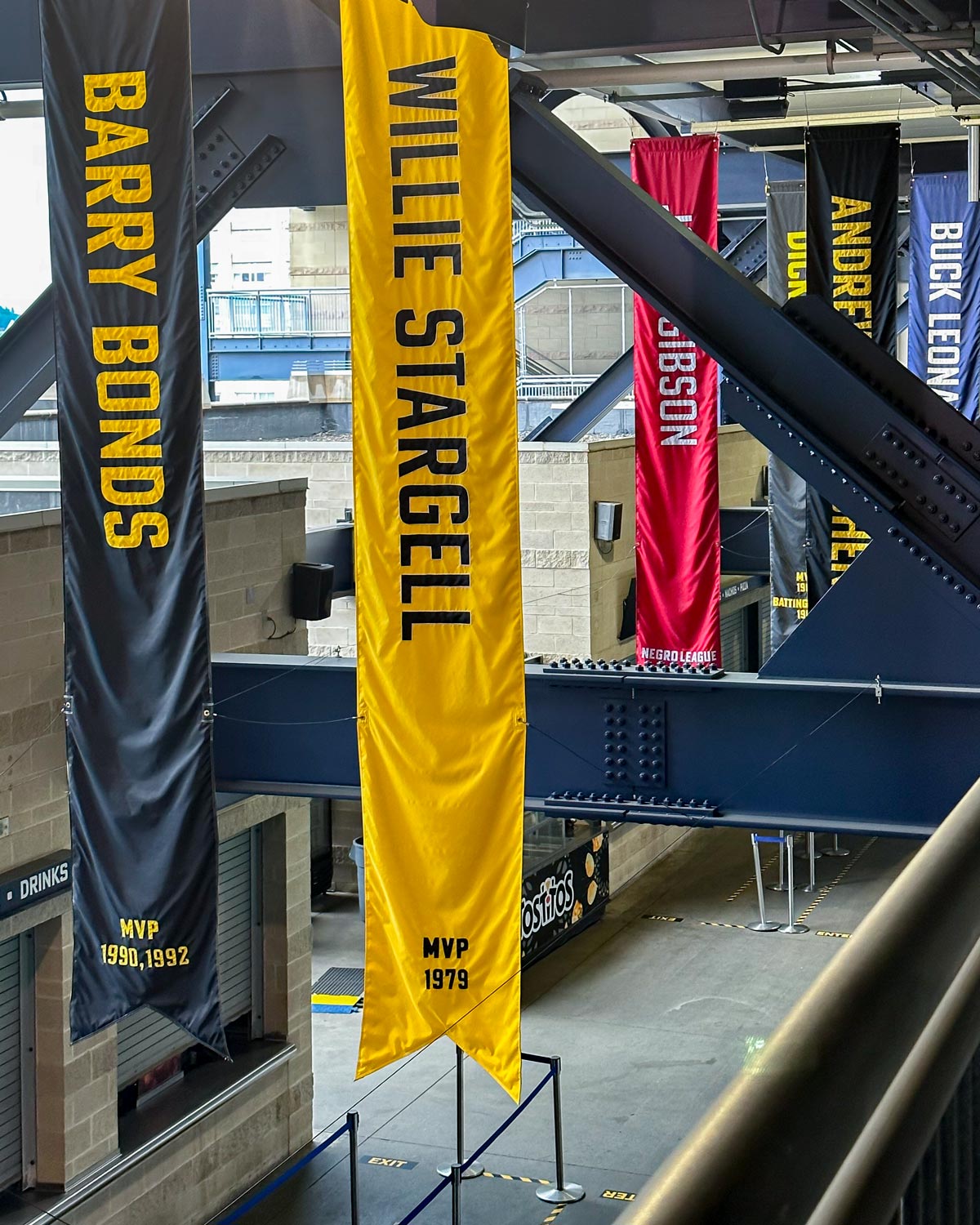 Large banners hanging vertically from the concourse ceiling highlight MVPs from the team’s past, as well as League Championship years, with Pirates graphics on the reverse – bringing yet another splash of team color to the space.