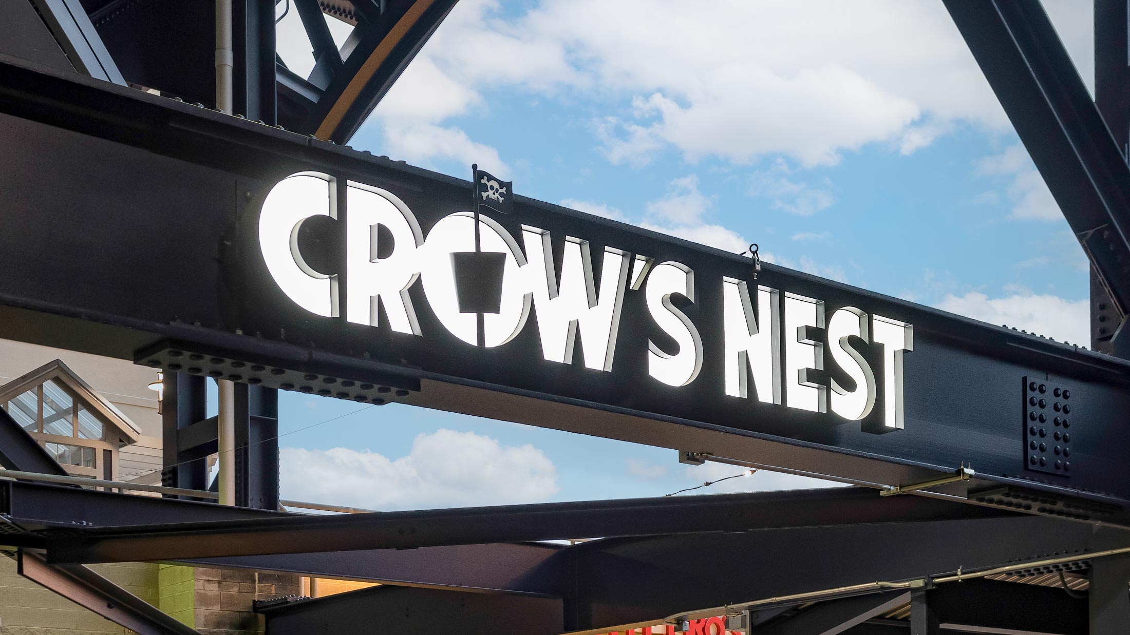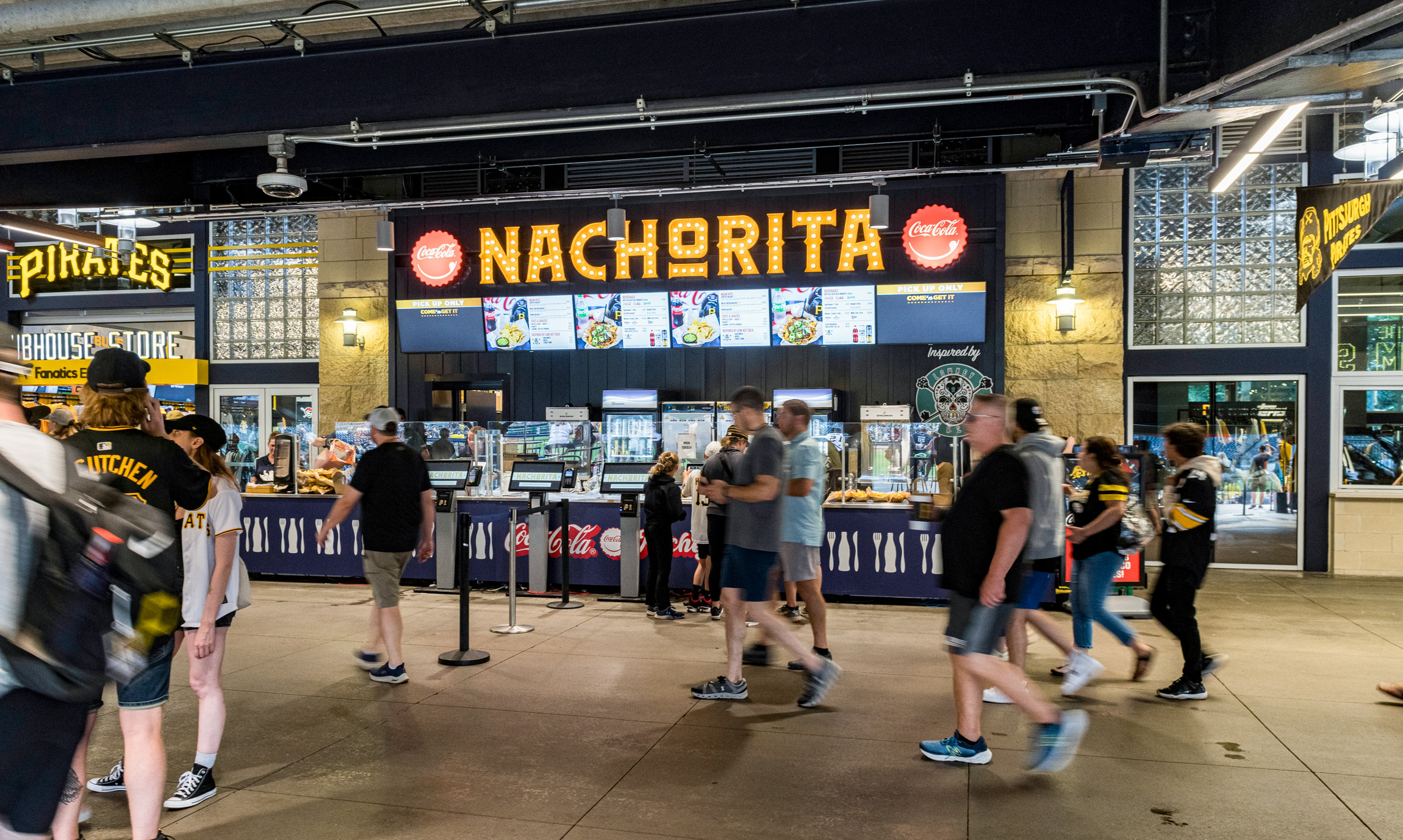 Custom signage at the Nachorita concession stand incorporates open channel letters and exposed bulbs, recalling the team’s retired number display and Pittsburgh’s industrial past.