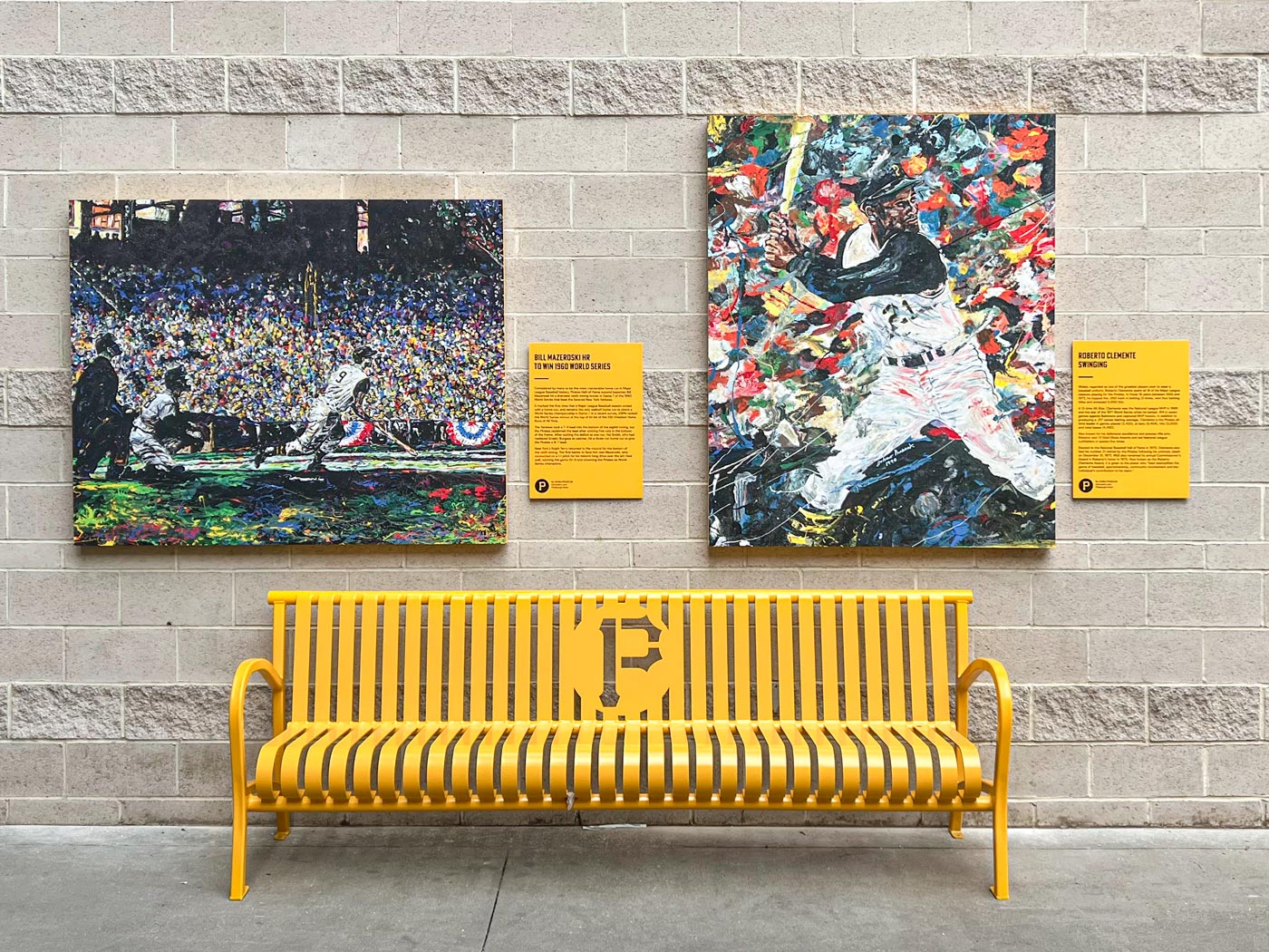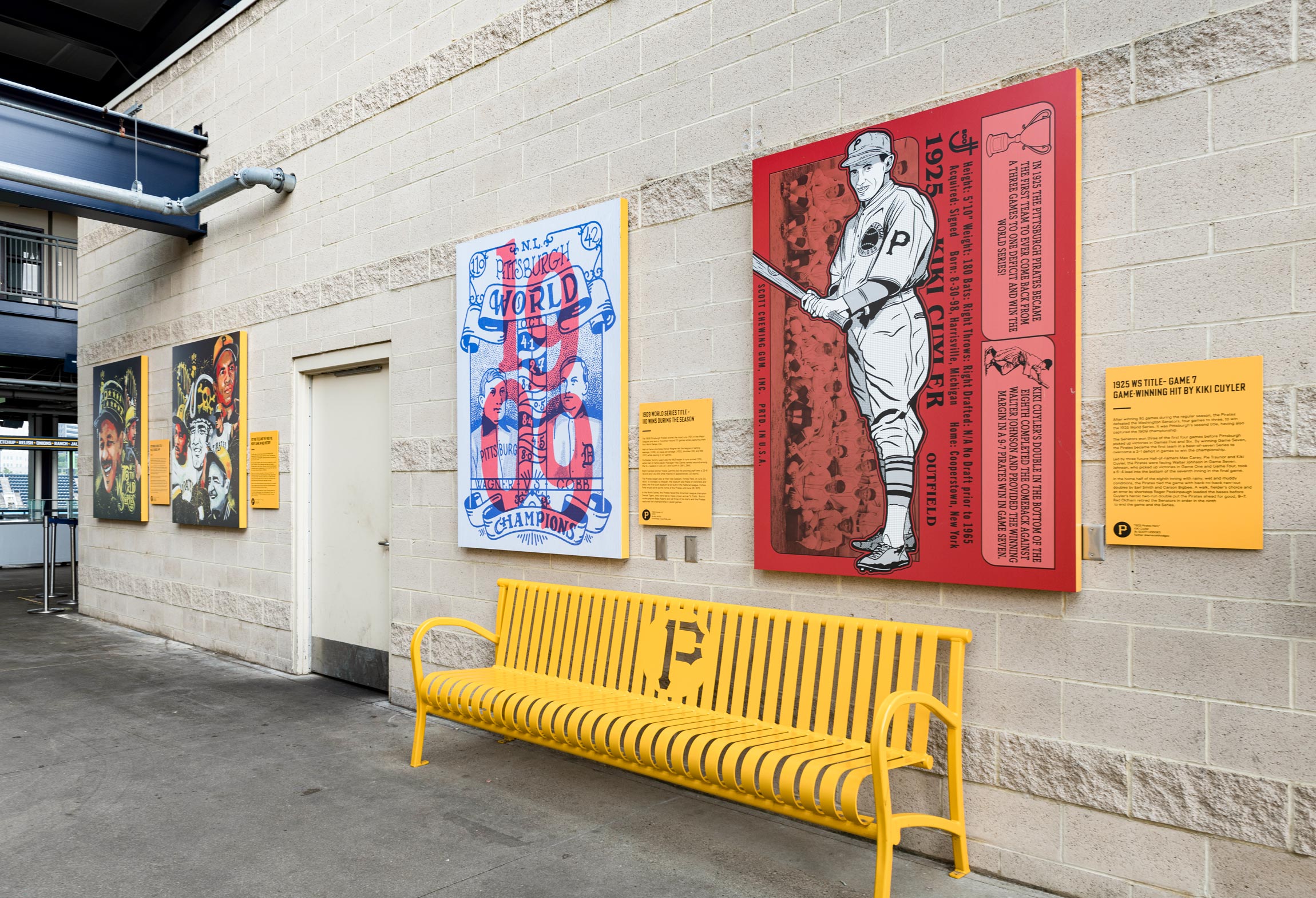 YDI designed metal panels throughout the concourse that touch on highlights of team history, from World Series appearances to All-Star games, historic ballparks, and more. Metal benches in the team’s trademark yellow also feature die-cut “P” logos.