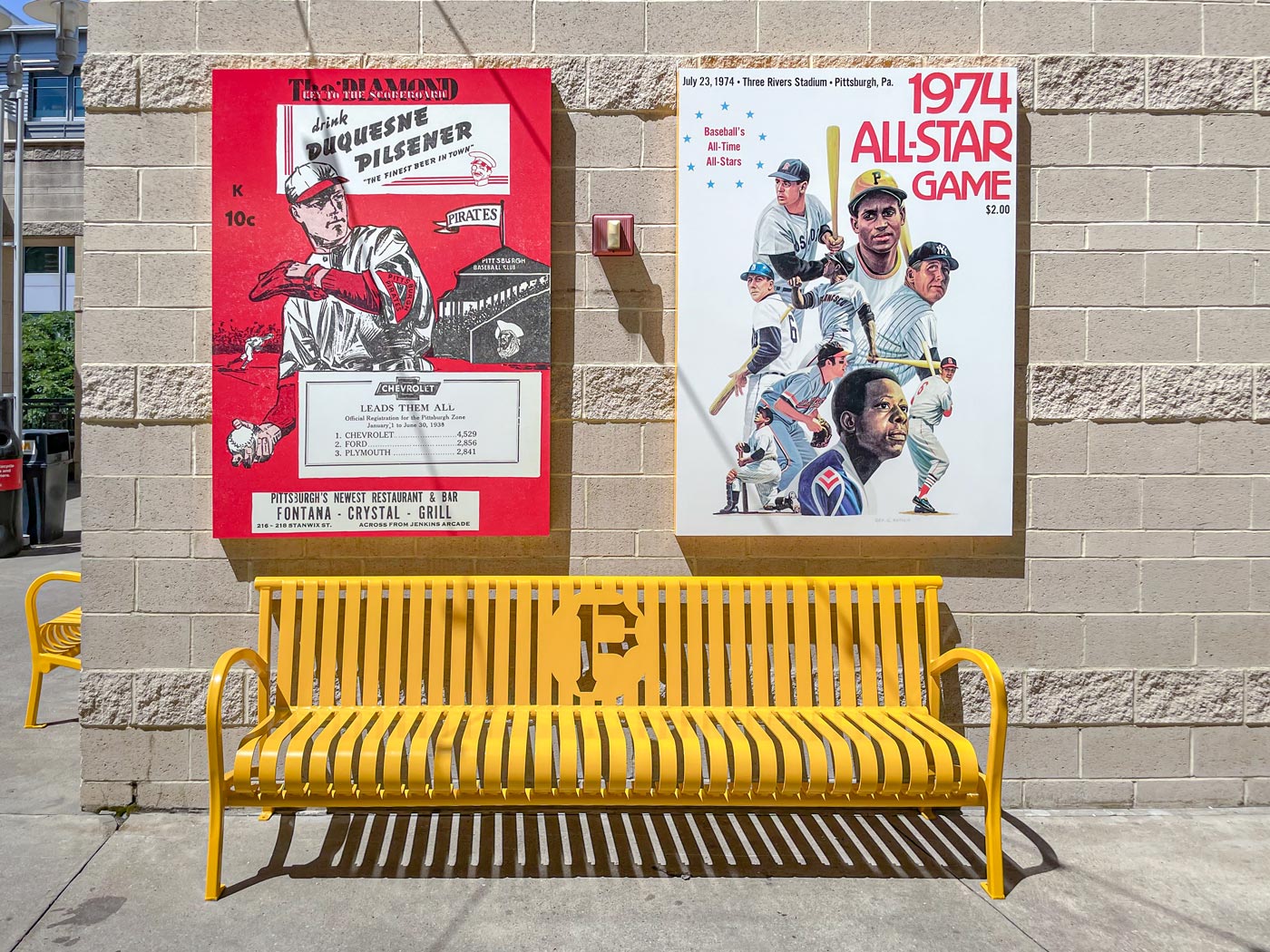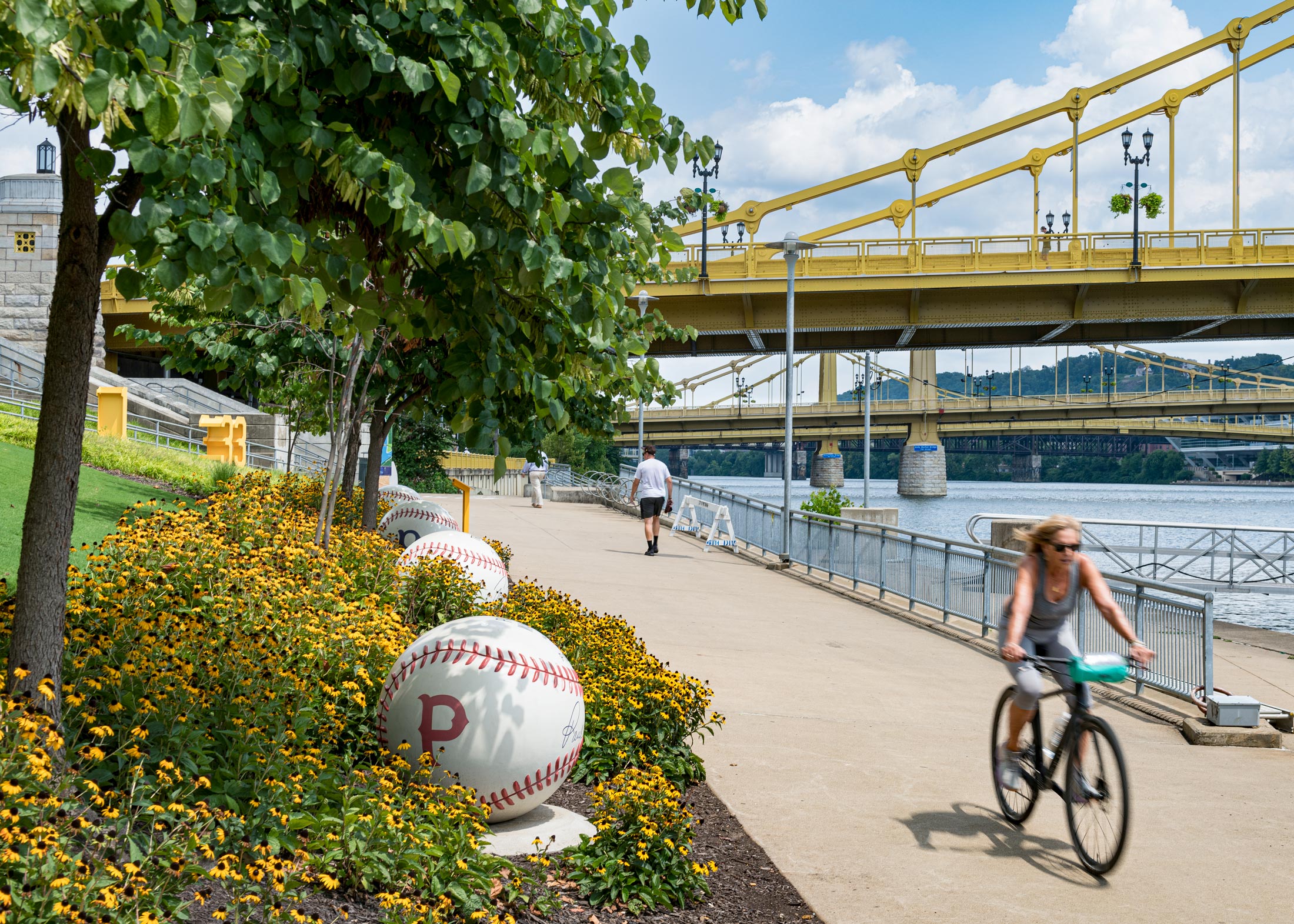 On the public portion of the Riverwalk, a series of 18 large concrete baseballs are adorned with historical logos and the signatures of past Pittsburgh players from the Pirates, as well as the Negro League’s Homestead Grays and Pittsburgh Crawfords.