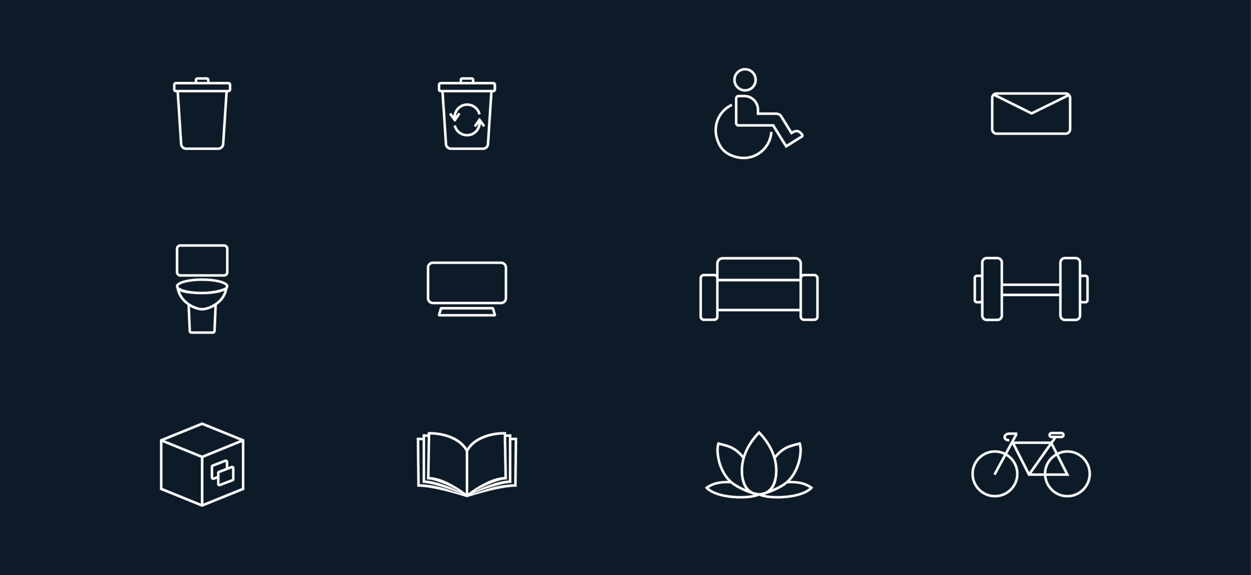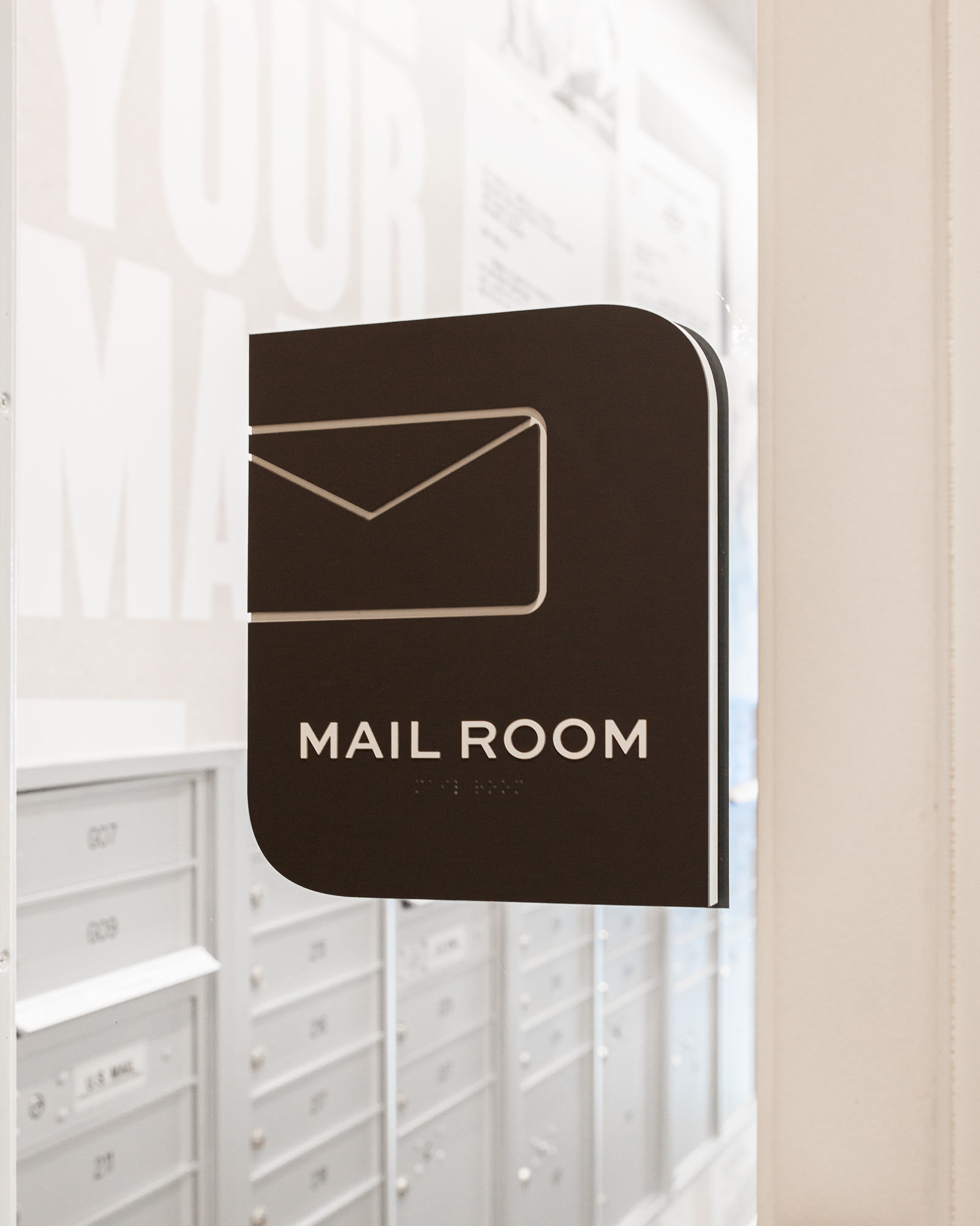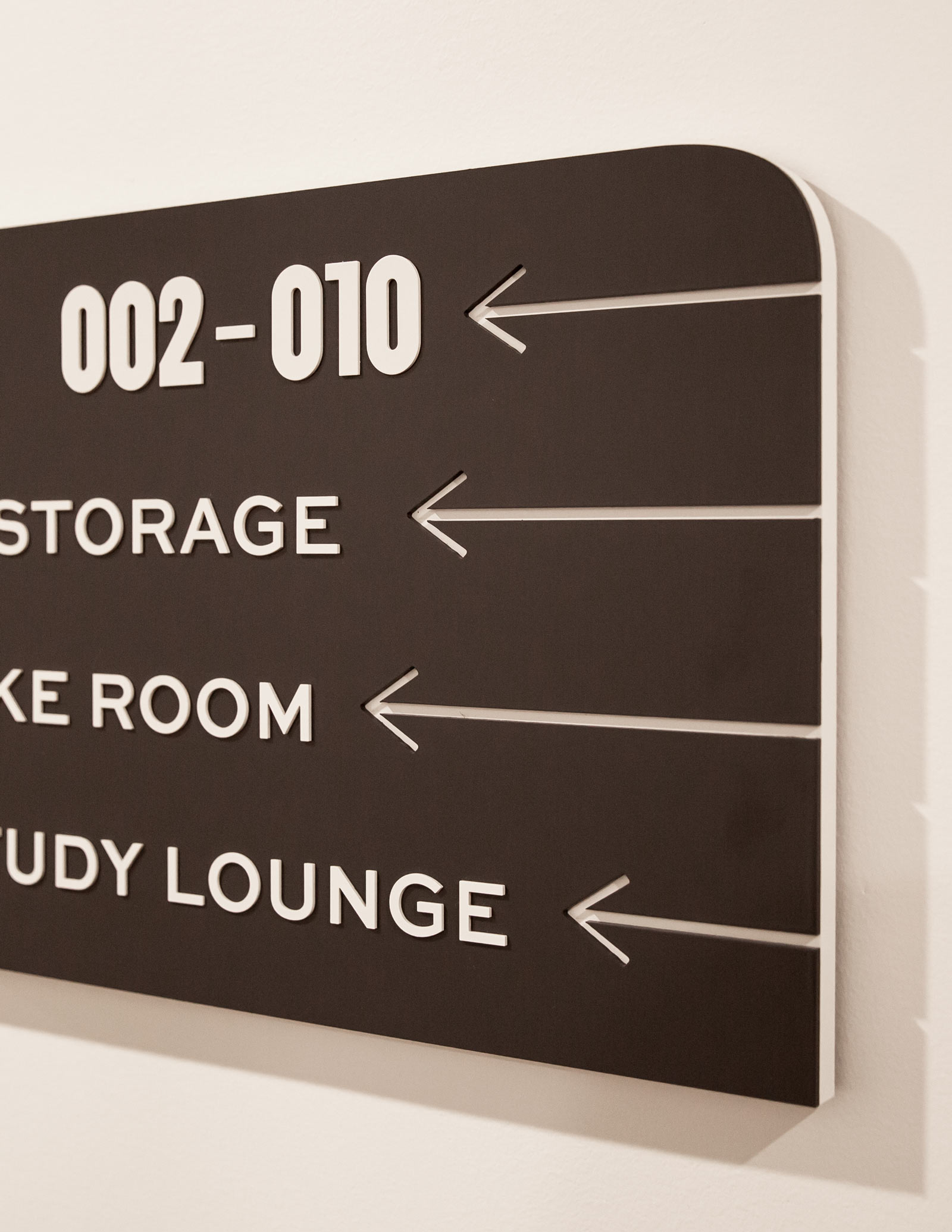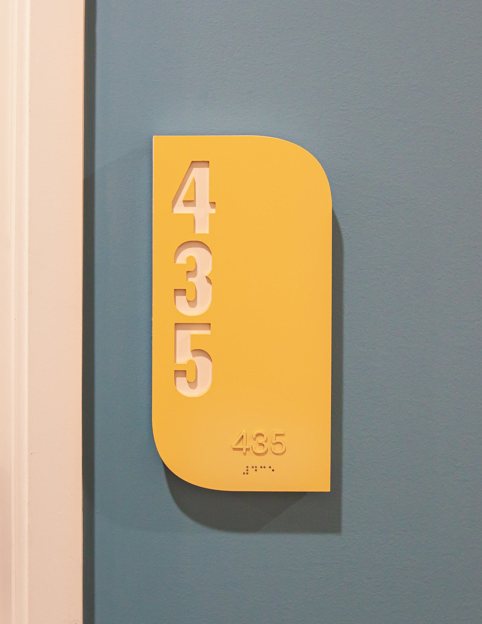 Room signage at The Enolia features gentle rounded corners with glyphs in relief, routed out of the front panel of the sign to reveal a lower layer. Amenity glyphs echo the rounded corners of the sign. Unit ID signage features large routed numbers as well, and colors correspond to the bright finishes used on accent walls beside the entry to each unit, bringing an extra pop of color to residential hallways.