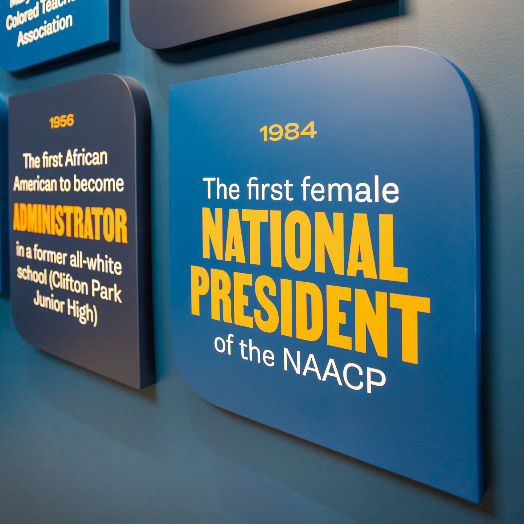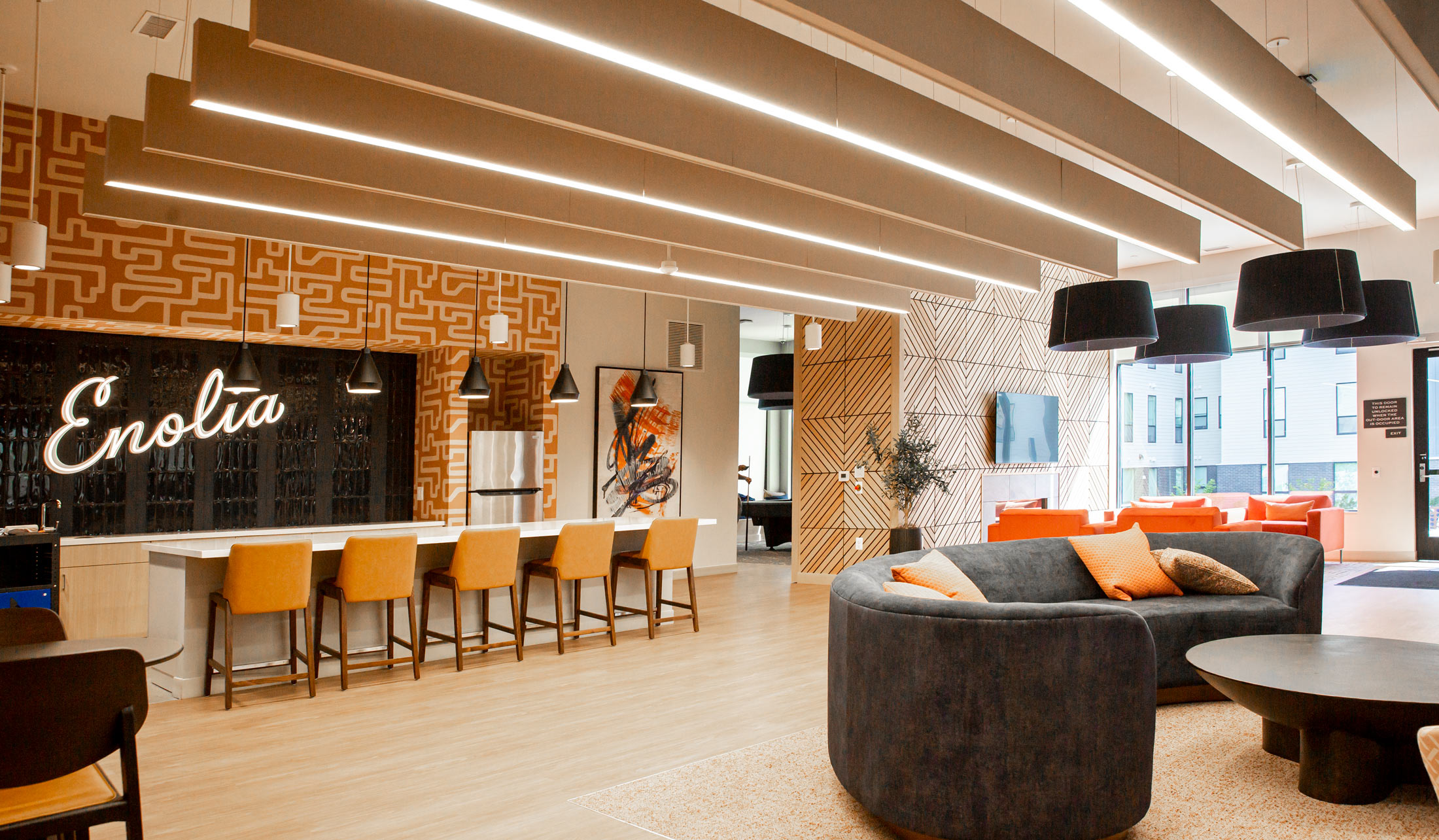 Upon entering the building, residents are greeted by a branded reception area featuring a large “Make Your Mark” motif, which honors the influential life that Enolia McMillan lived. Around the corner, a wall of dimensional panels highlights several of her iconic “firsts.”
