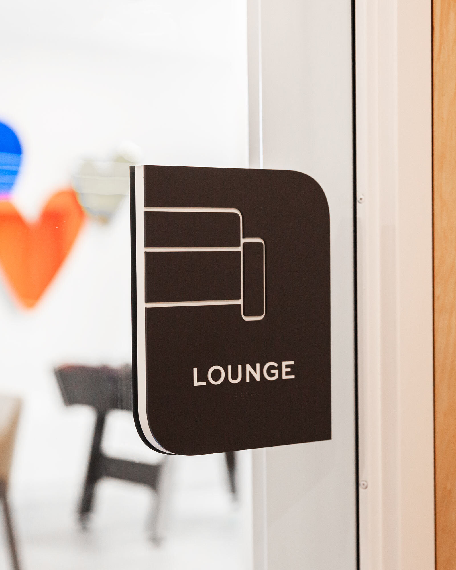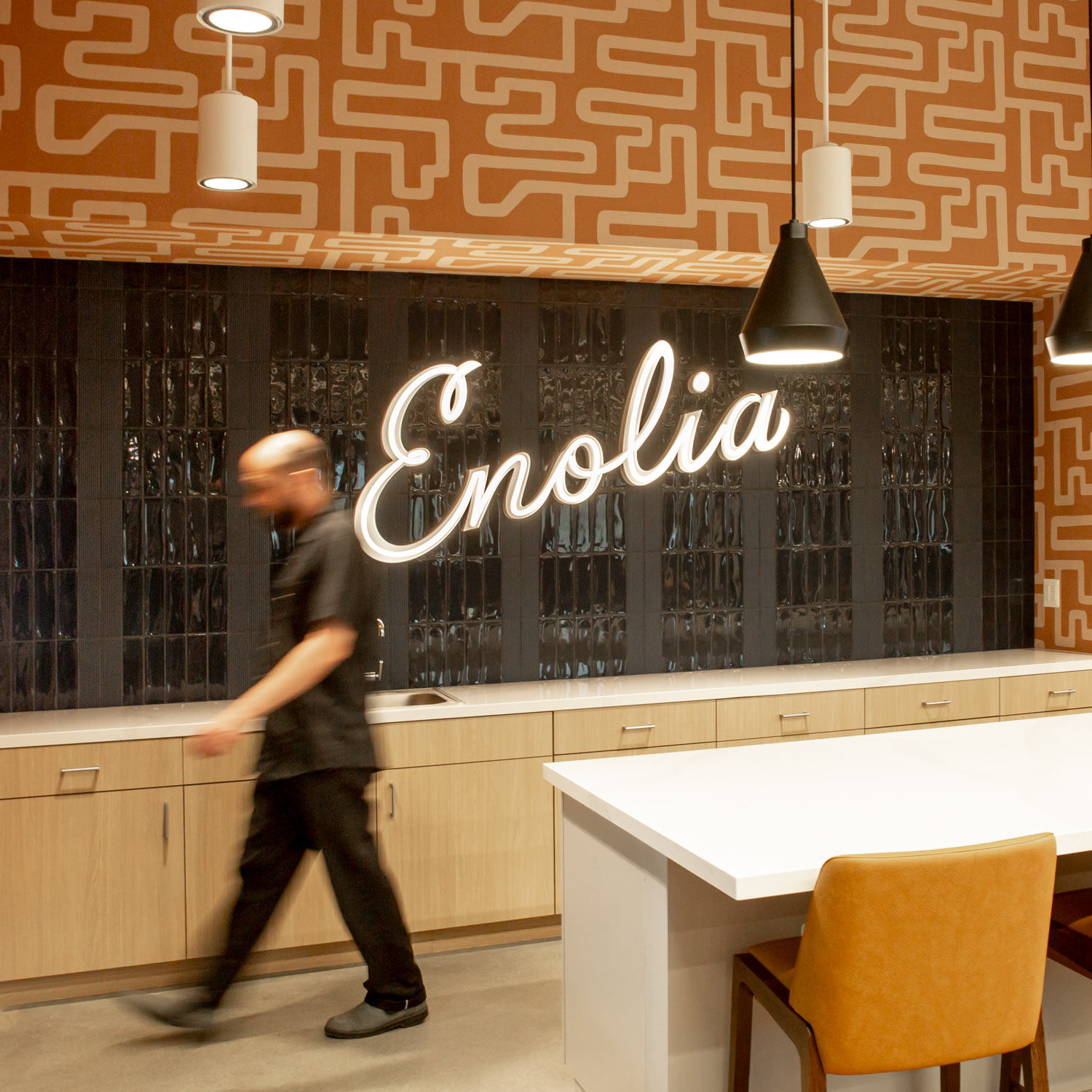 The wordmark based on Enolia’s signature also fits right in among the vibrant finishes of the building’s interior. Open channel letters housing LED neon stand out against a backdrop of high-gloss tile in the Enolia’s common kitchen.