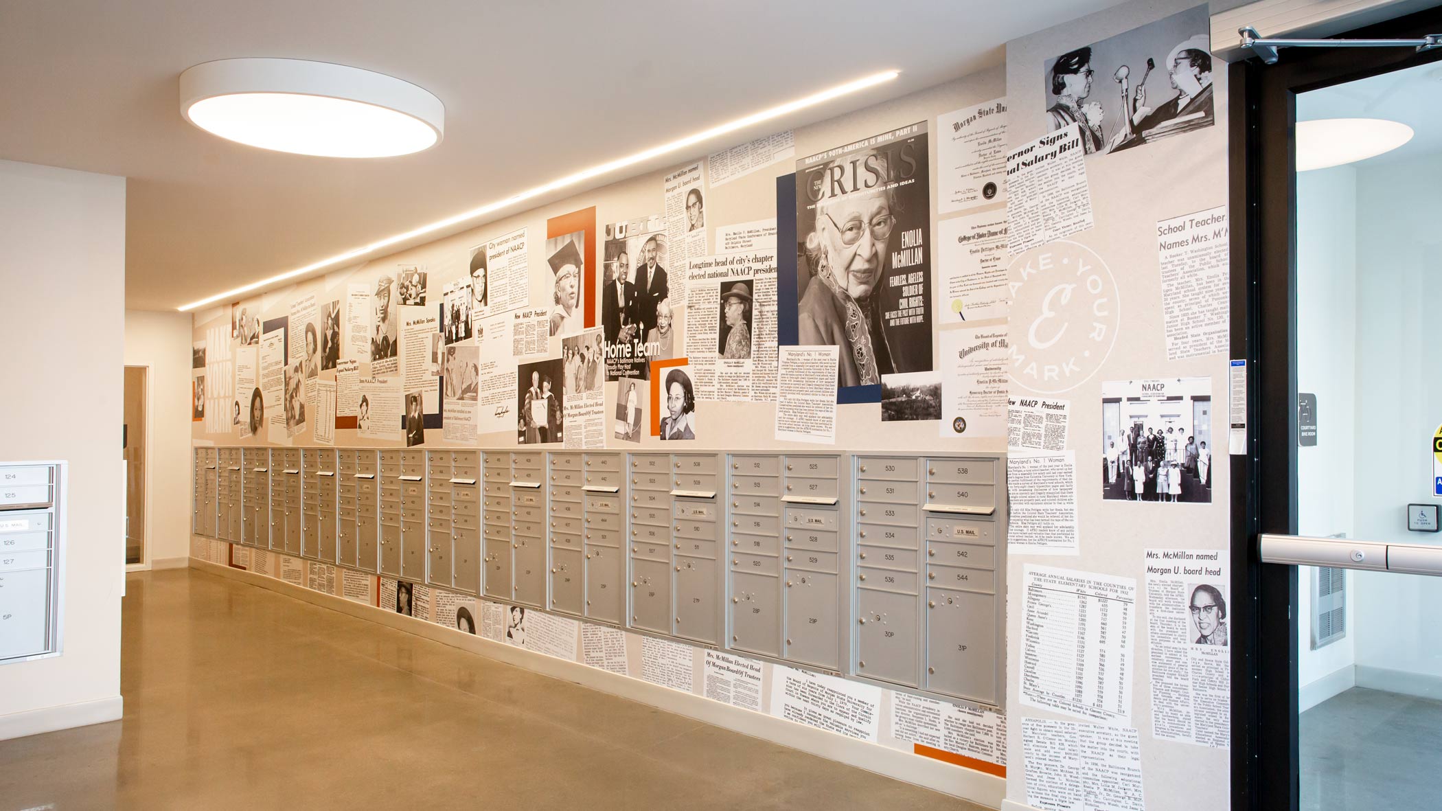 In the building’s mailroom, YDI designed a collage of historic materials from Enolia’s life. From wall to wall, residents can read letters, newspaper articles, and other ephemera to learn more about the life of this extraordinary woman.