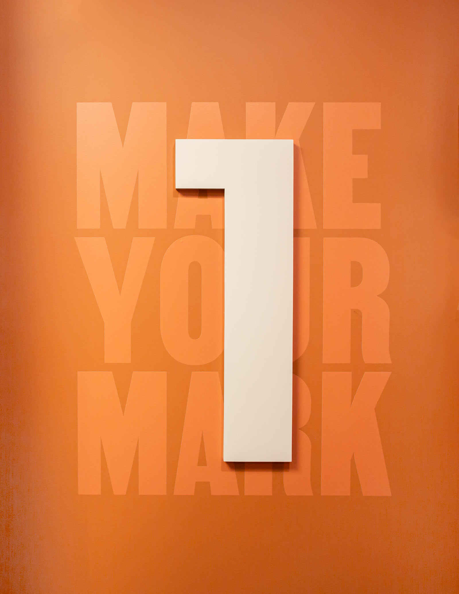At each elevator lobby, large dimensional floor numbers stand out against a tonal “Make Your Mark” graphic, with colors varying by level. The interplay of these two elements adds depth and an extra splash of the Enolia’s brand to these common areas.