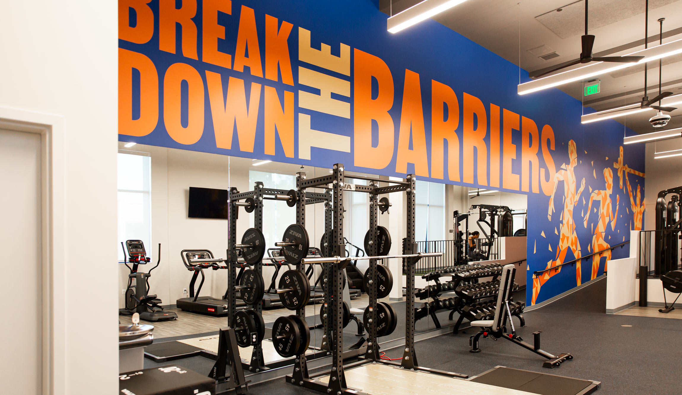 In the fitness center, YDI designed large-scale wall graphics that use Morgan State’s official colors. Dynamic polygonal figures are paired with a bold message of inspiration, set in the Enolia brand’s typeface.