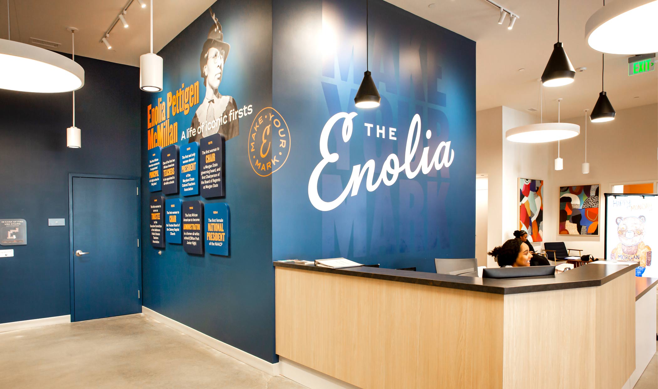 Discovering her remarkable story during our naming process, with its deep connections to Baltimore and Morgan State, led to a very unique and meaningful branding direction for this project. The Enolia brings off-campus student apartments to the heart of Northeast Baltimore, not far from Morgan State’s campus.