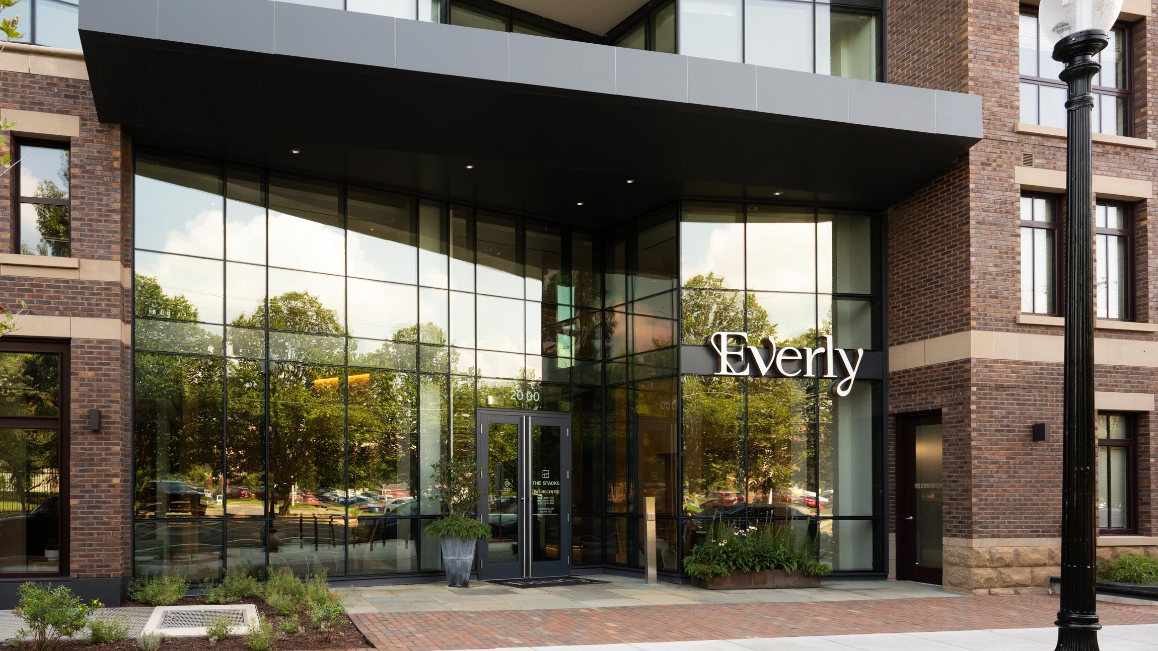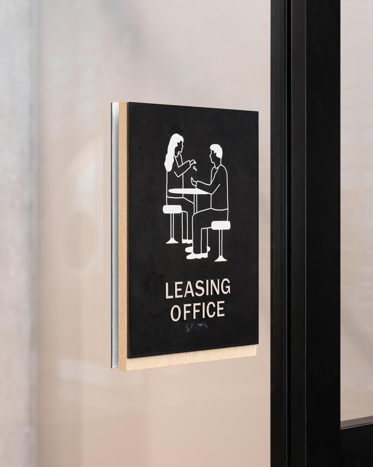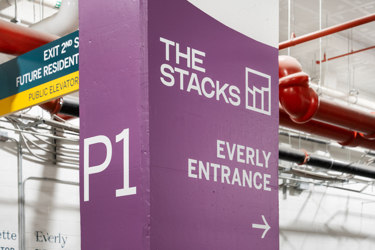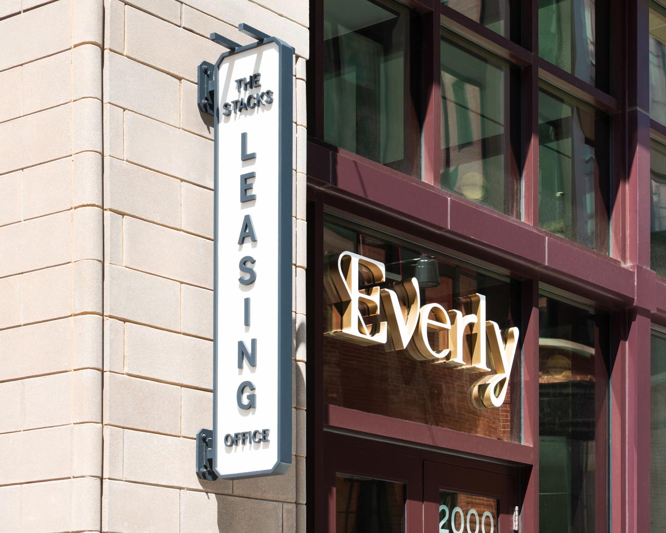 The third apartment building at The Stacks, Everly, features illuminated identity signage designed by YDI, as well as a vertical blade sign denoting the leasing office for the whole development. Variations in each of The Stacks’ buildings’ entrances presented an exciting challenge for YDI, to integrate identity signage seamlessly into the architecture.