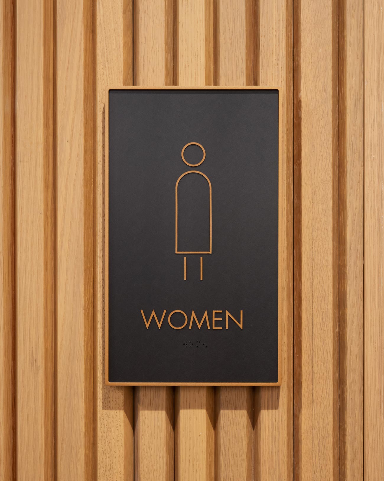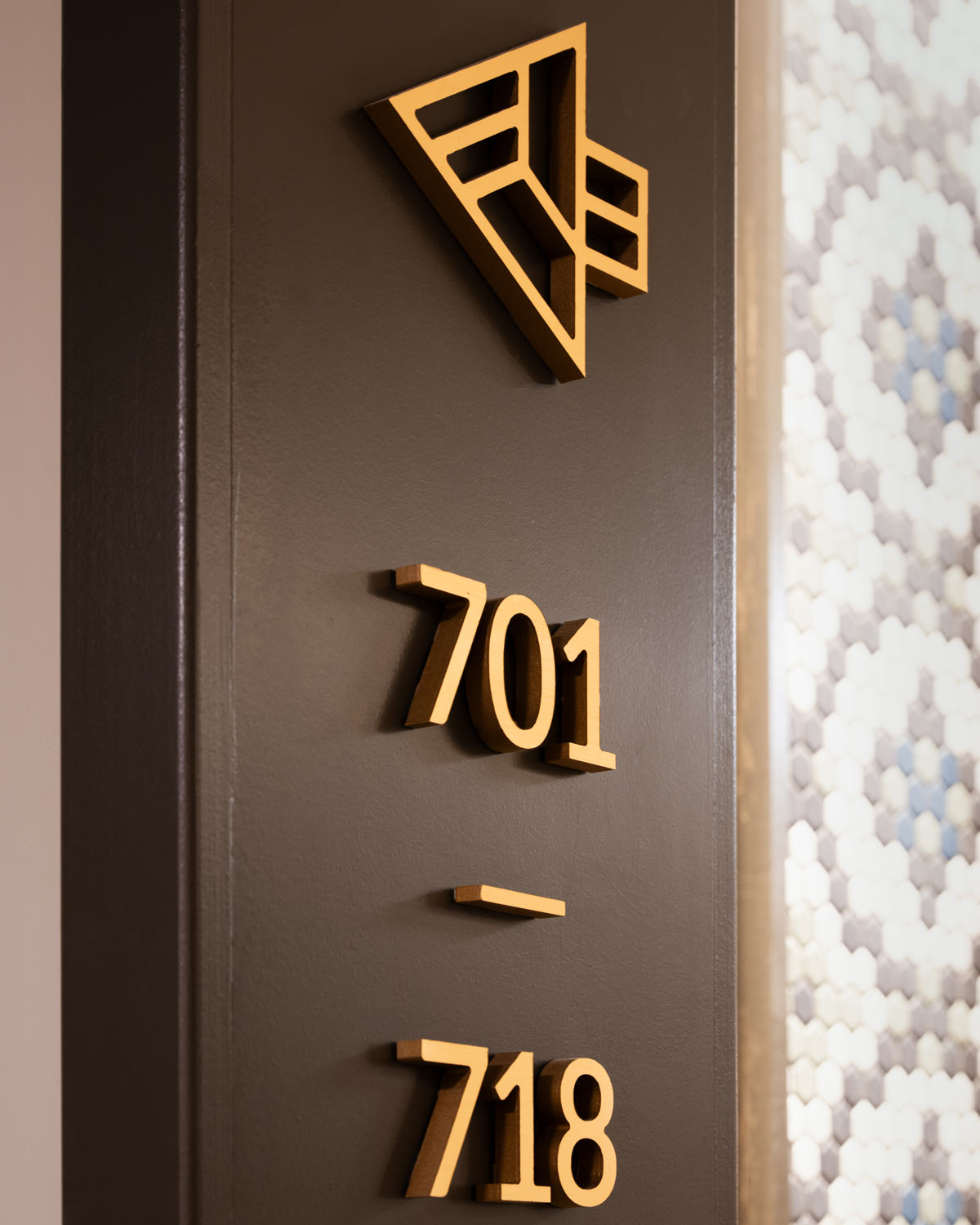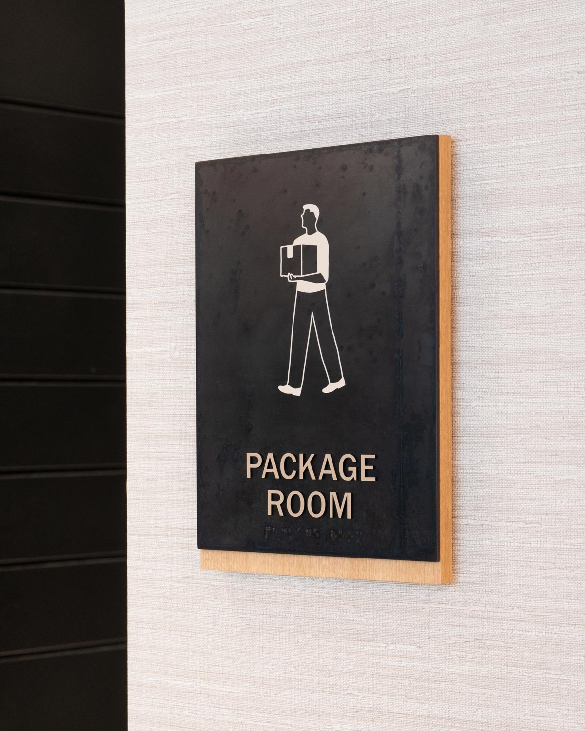Interior signage is upscale and minimal, with simple glyphs and an emphasis on materials that pair well with the building’s elegant finishes – the metallic veneer used on panels echoes the use of metal in the building’s interior. The gentle curves in glyph illustrations reference an ‘arch’ motif in the Byron brand. YDI designed signs that feel right at home with both the existing brand of the building and its interior design.