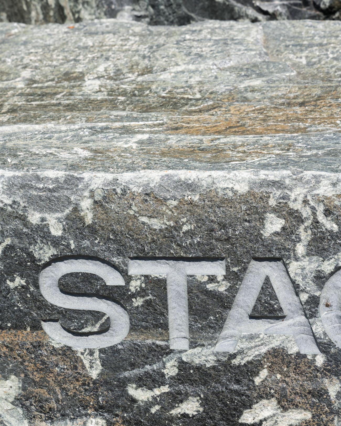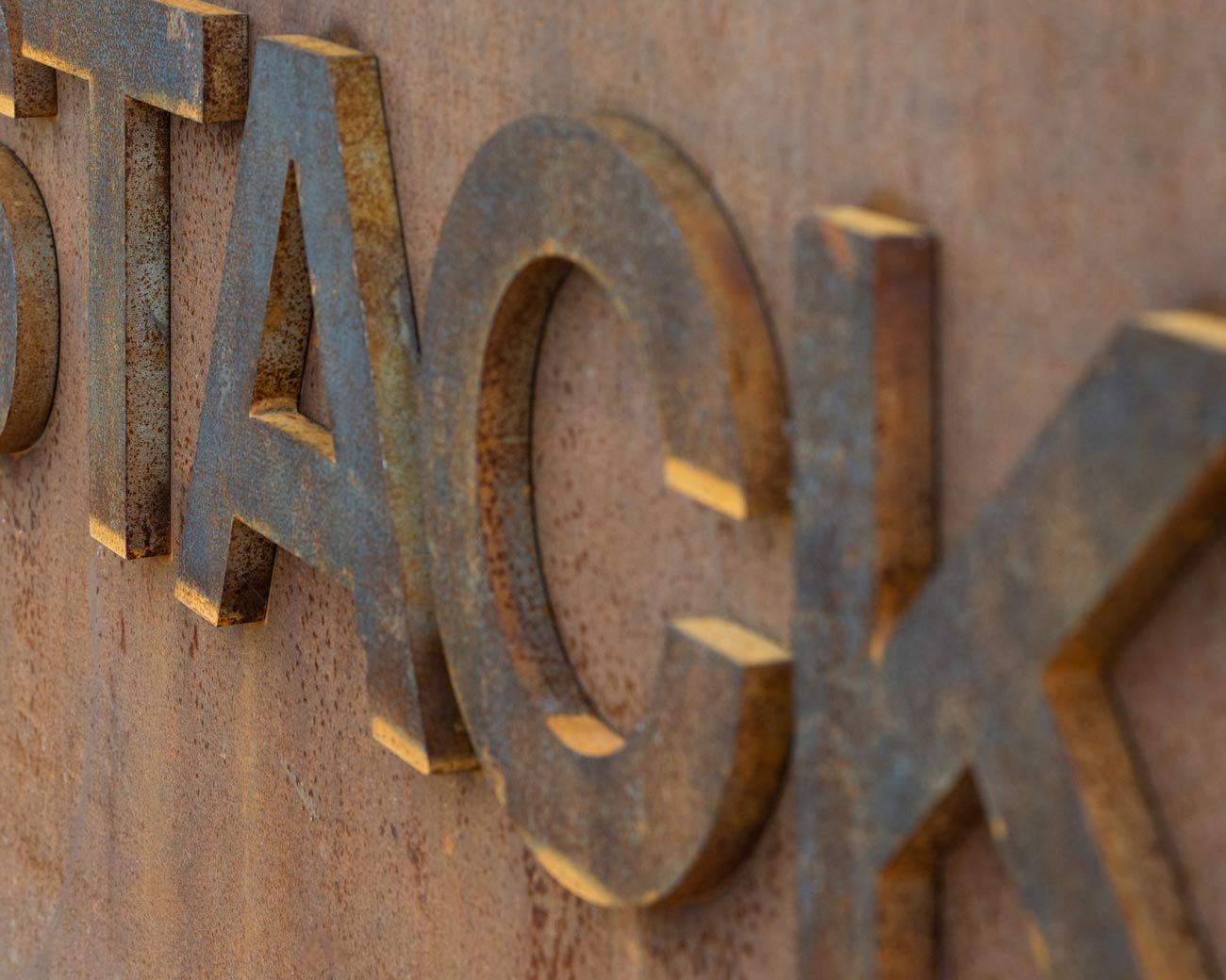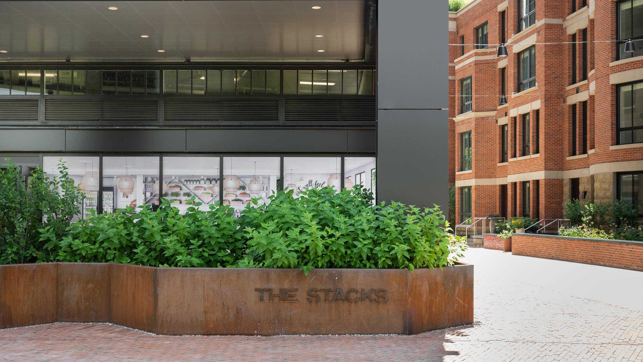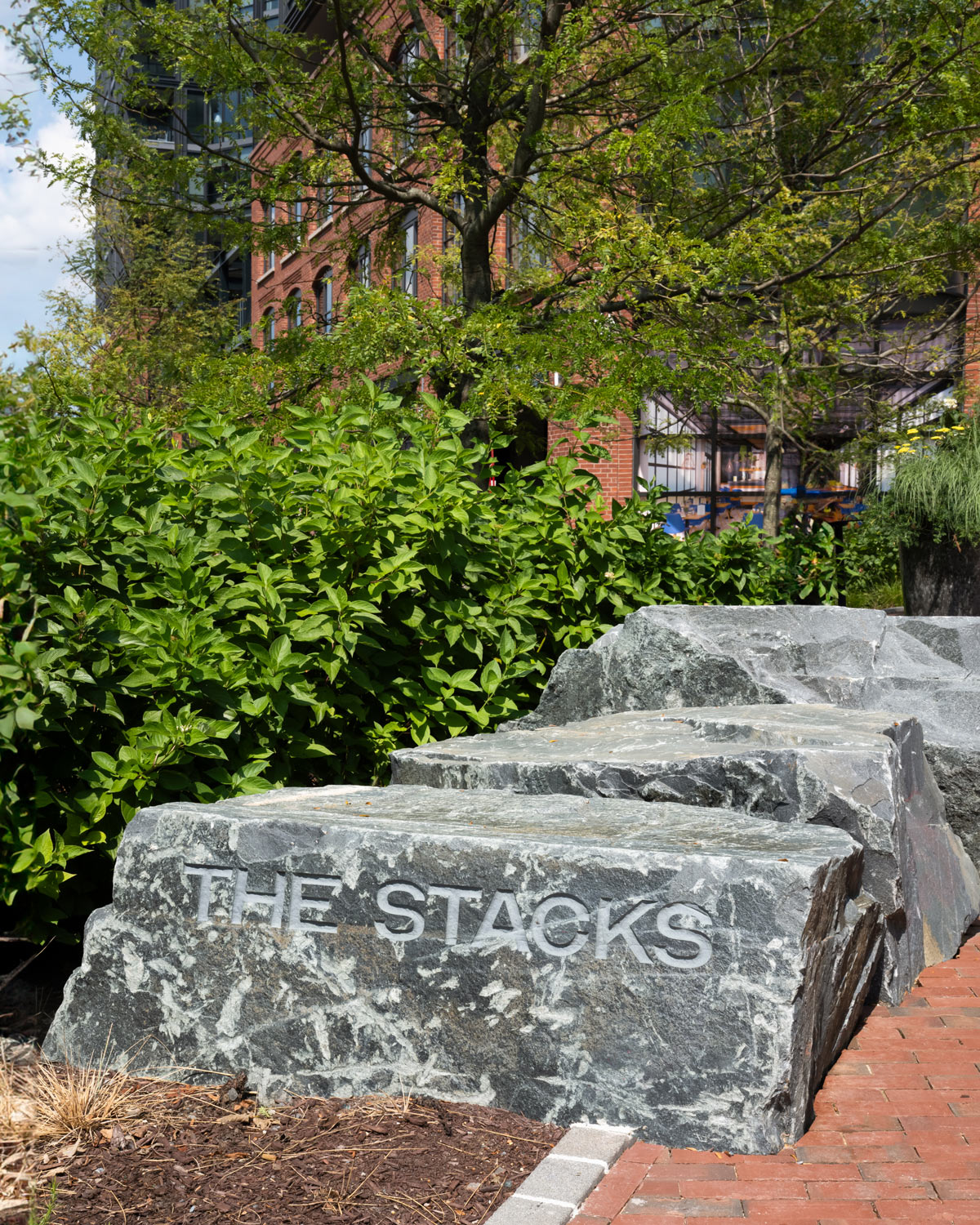 At entrances to the Stacks, YDI integrated the name of the development into landscaping elements: mounted on the steel wall of a planter, and carved out of stone. These understated signs blend into natural materials to create a seamless branded experience.