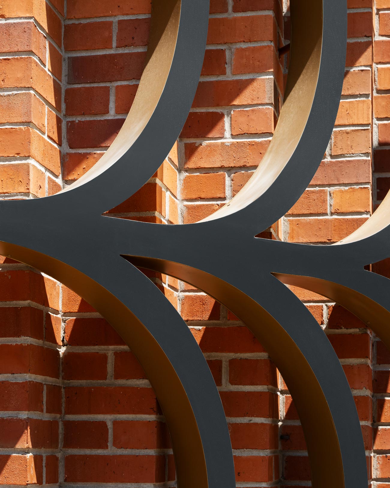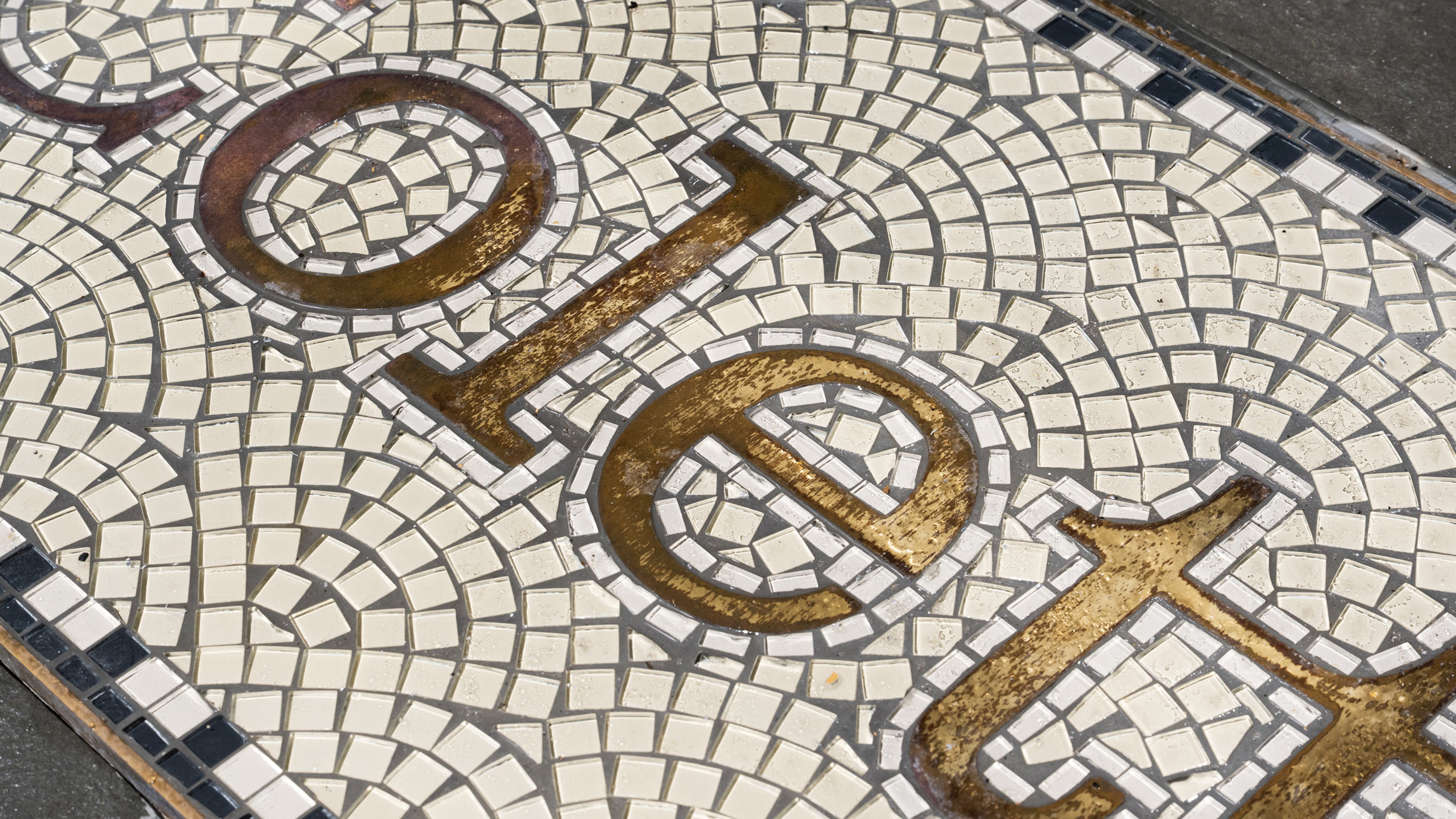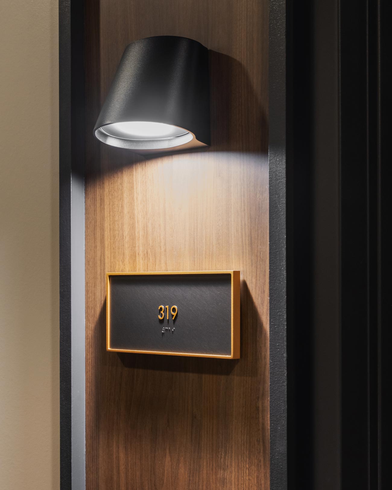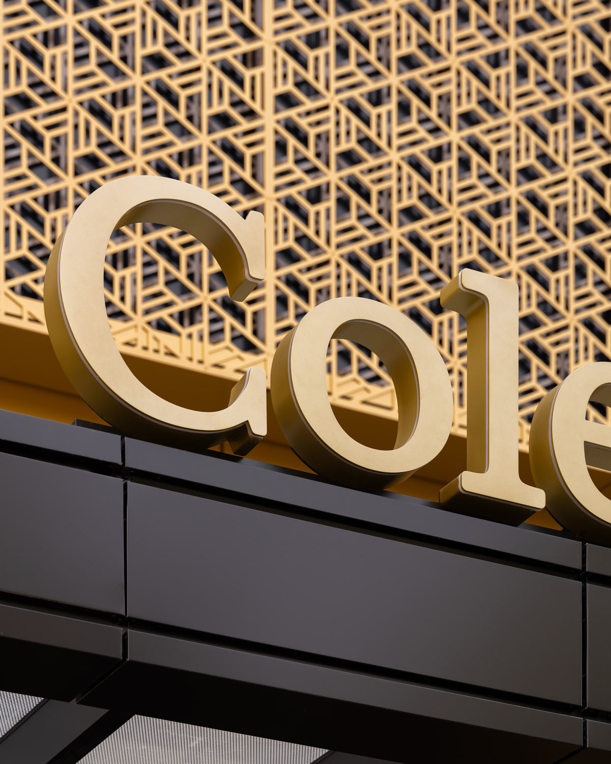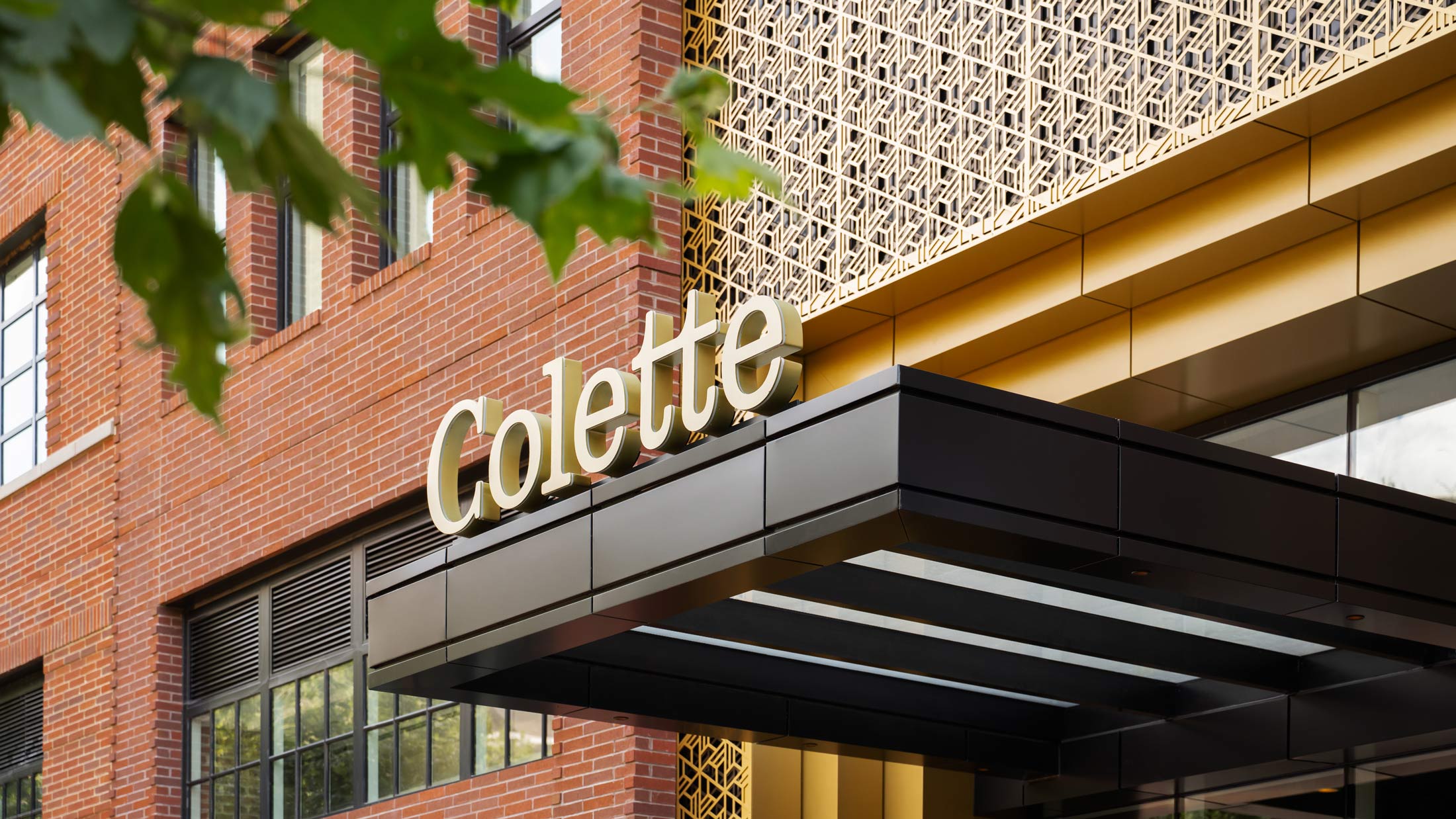 A YDI-designed raceway sign at the entrance to Colette, another of the Stacks’ residences, is set against a backdrop of intricate brand patterns on the building’s facade. A brass version of the building’s name was also inlaid in a custom mosaic on the ground outside. Signs such as these represent a concerted effort to organically incorporate signage into the Stacks’ architecture.