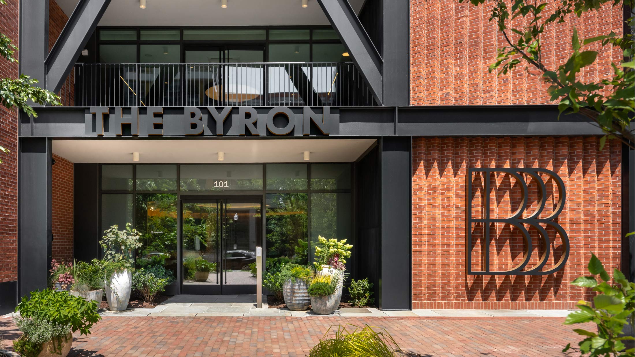 At the Byron, an apartment building with an emphasis on understated elegance, YDI designed halo-lit metal raceway signage at this secondary entrance. Nearby, a large-scale dimensional “B” logo sign throws playful shadows on angled sections of a brick wall.