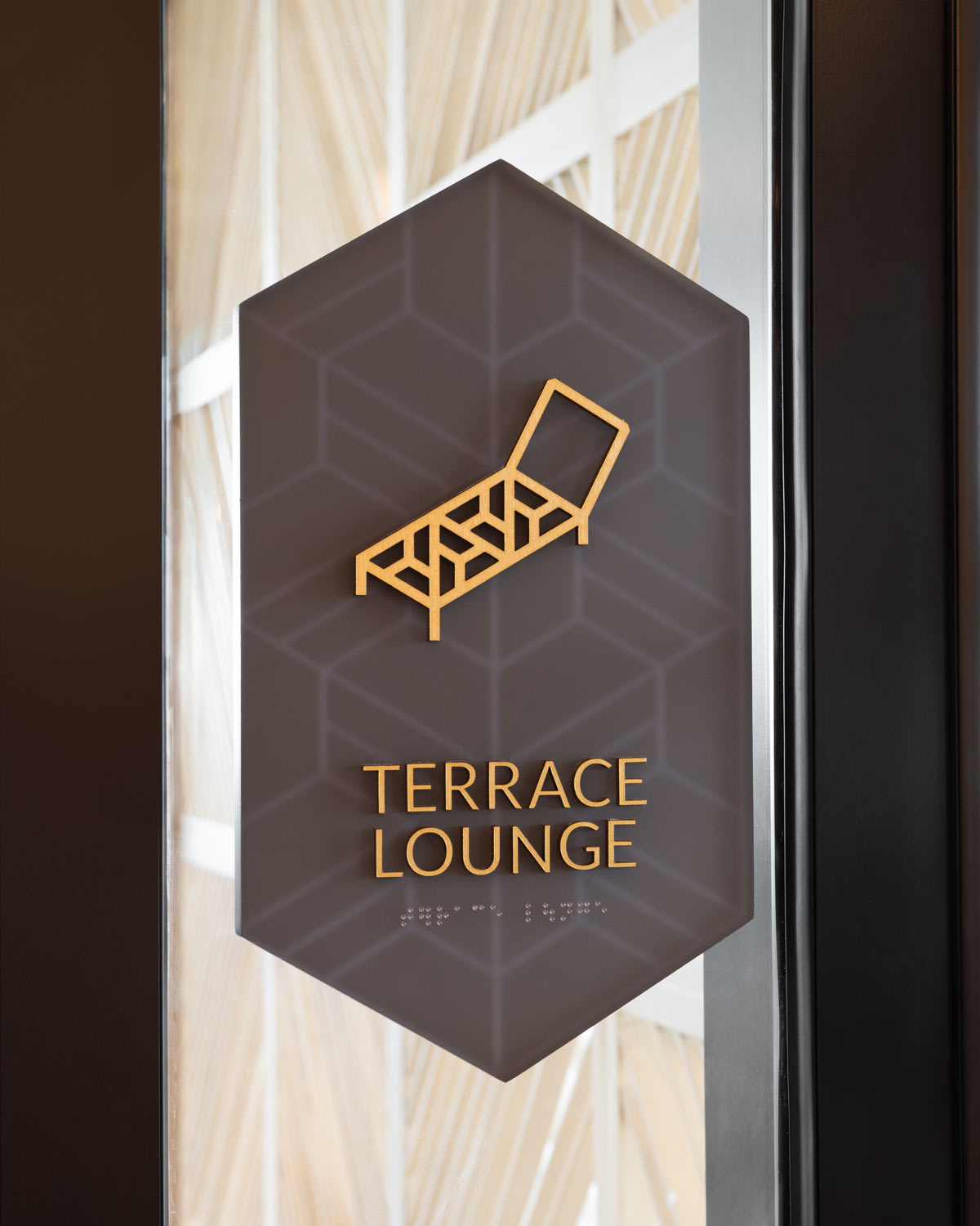 Colette’s complex brand patterns served as inspiration for interior signage, as well. YDI translated this geometry into amenity glyphs and arrows, as well as a back-printed pattern on ADA signage throughout the building.