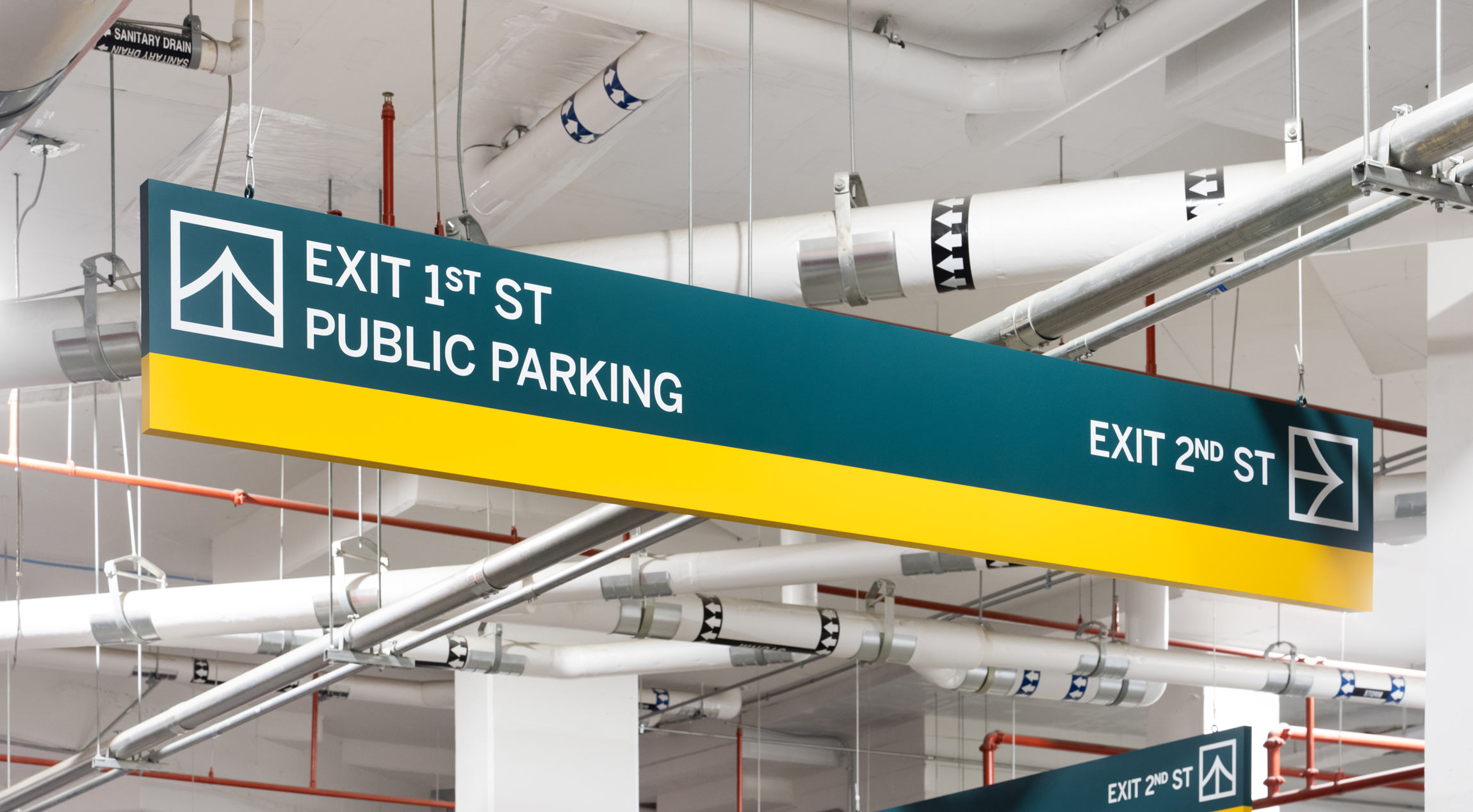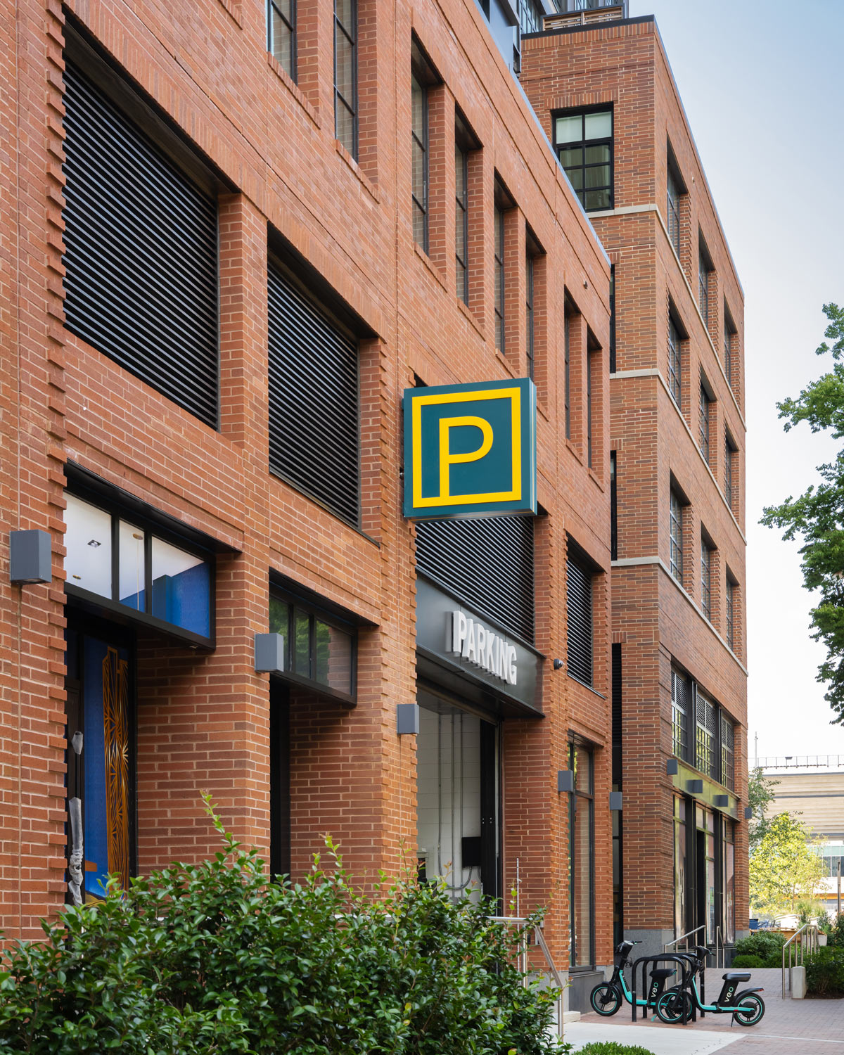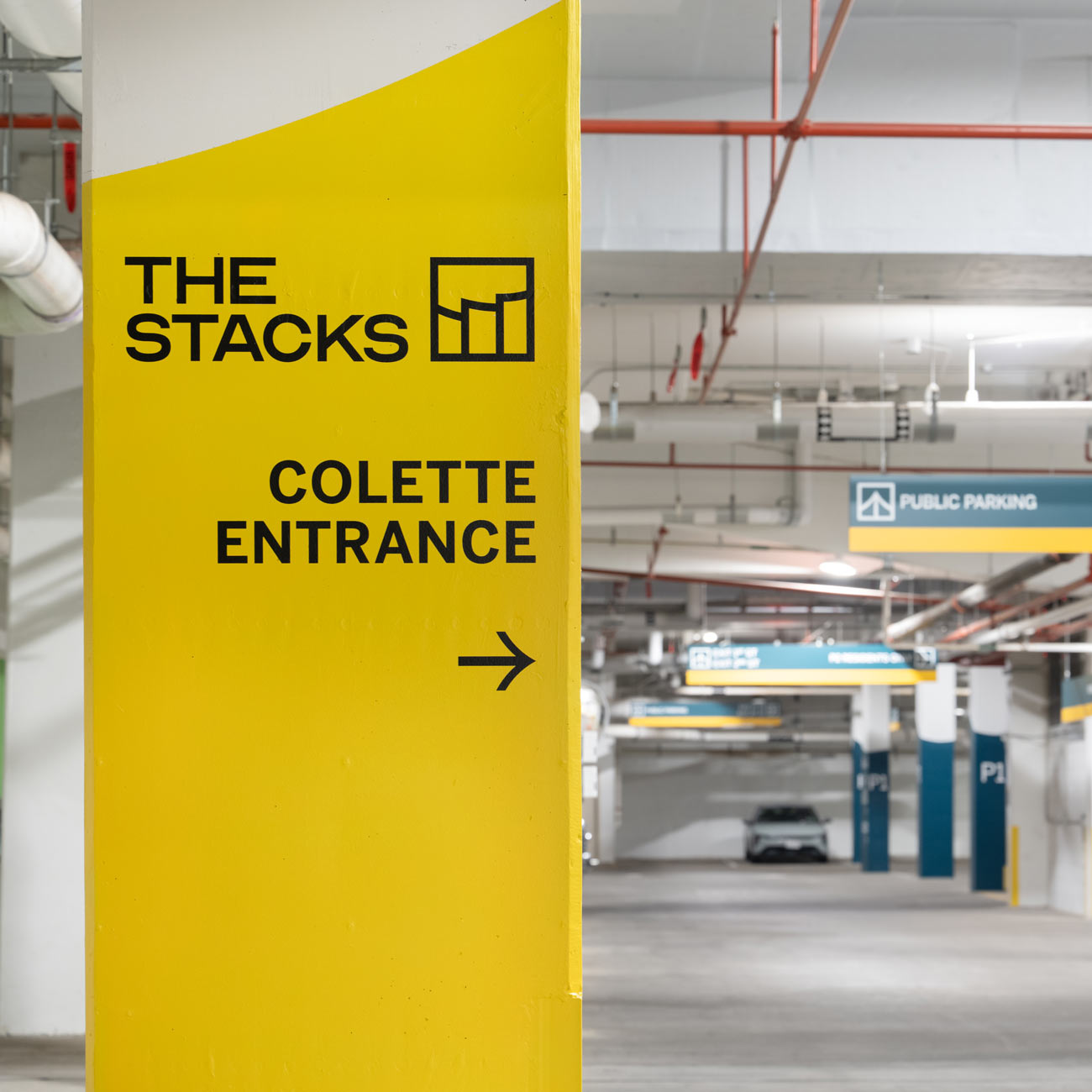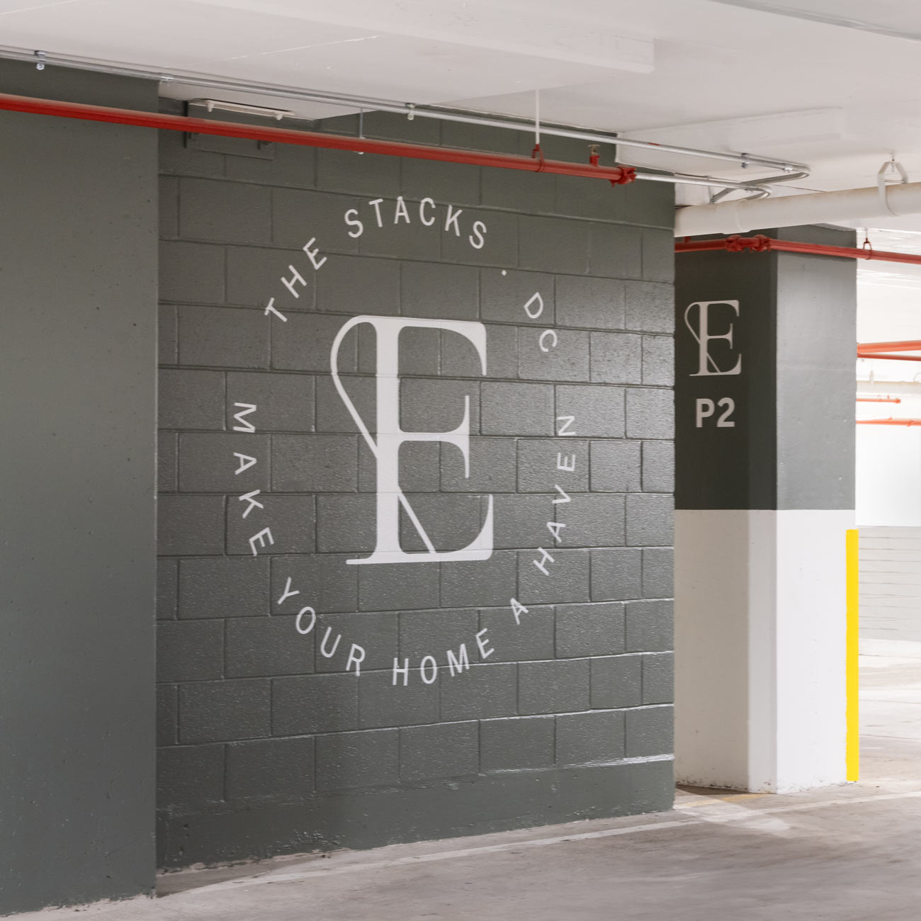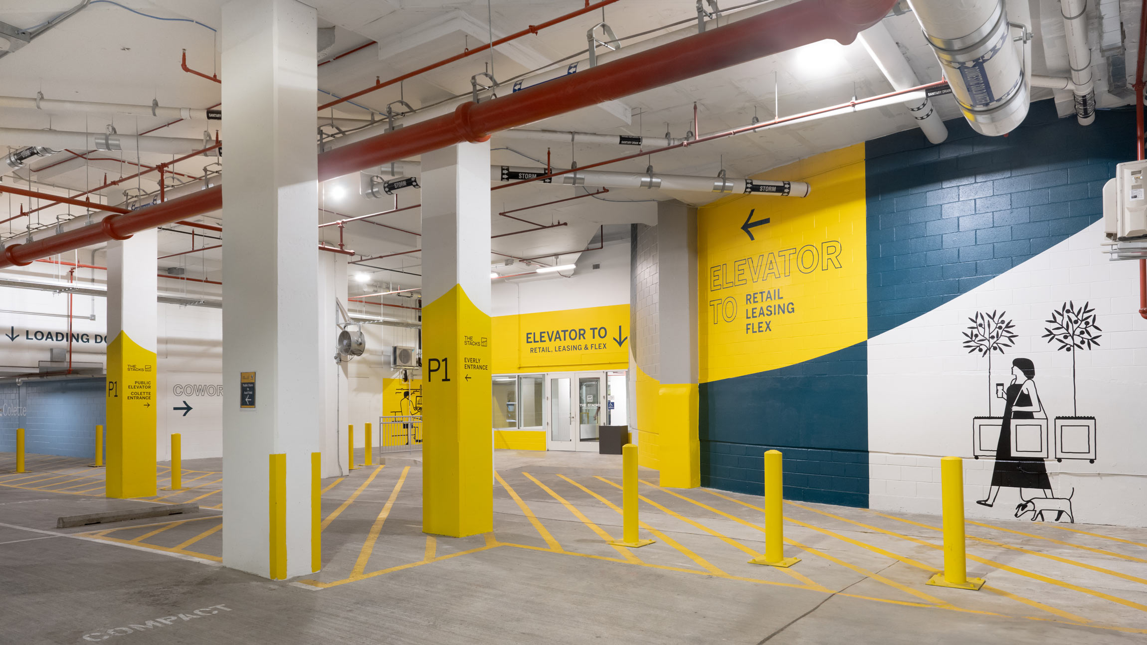 YDI navigated a complex wayfinding challenge and developed messaging for the entire parking garage while also brightening up the environment with large fields of color and illustrative graphics inspired by the glyph family from the Everly building.