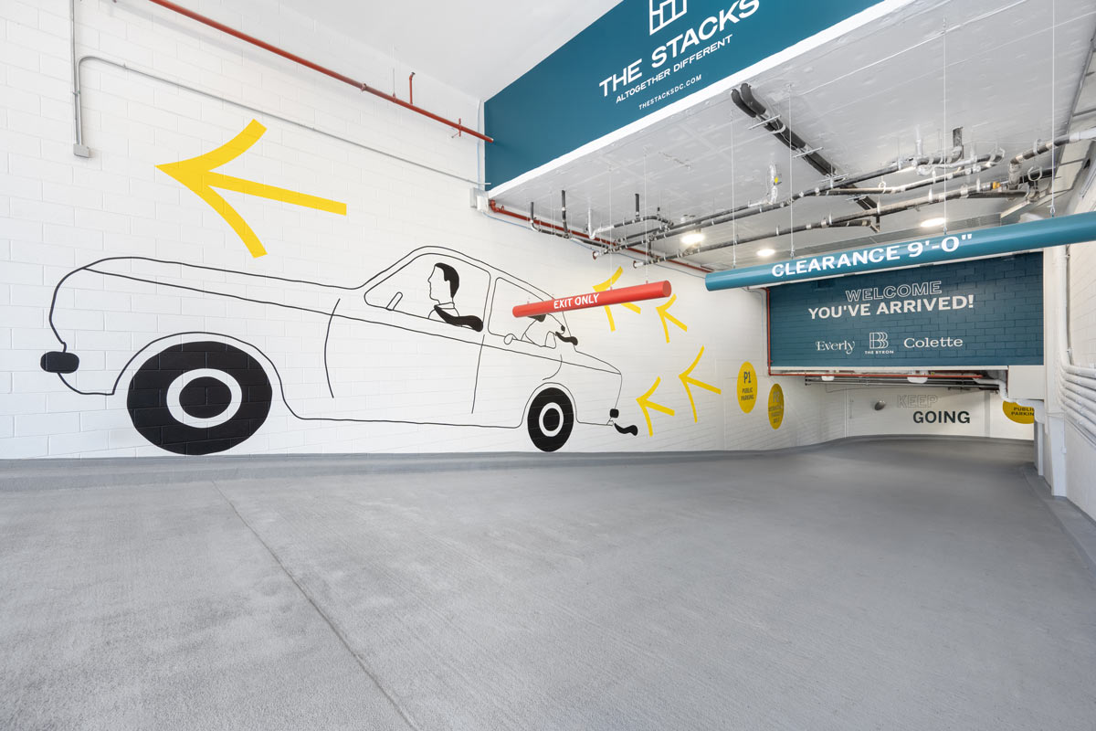 The extensive parking garage serving all three buildings at The Stacks features playful murals and splashes of color, paired with helpful directional messages to guide residents to their homes. In addition to livening up the space, color helps delineate the many destinations accessible through the garage.